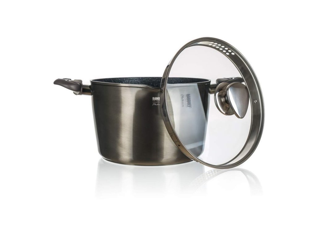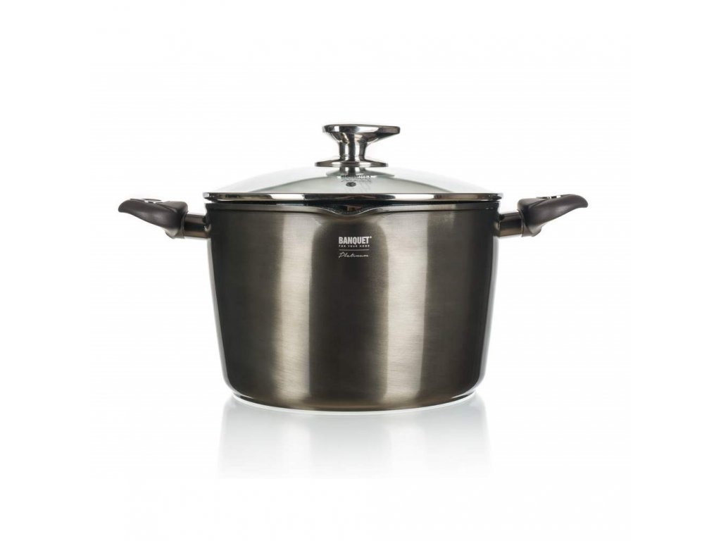 Hliníkový litý kovaný hrnec s výlevkou a se skleněnou poklicí METALLIC PLATINUM s nepřílnavým povrchem o rozměru 24 x 15,5 cm, vnější karbon metalický nástřik, tloušťka stěny 3 mm, plně indukční dno, soft-touch rukojeť a nerezový knob. Nepřilnavý povrch je velmi tvrdý a odolný proti poškrábání. Hrnec je odolný proti nárazu.Doplňkové parametry