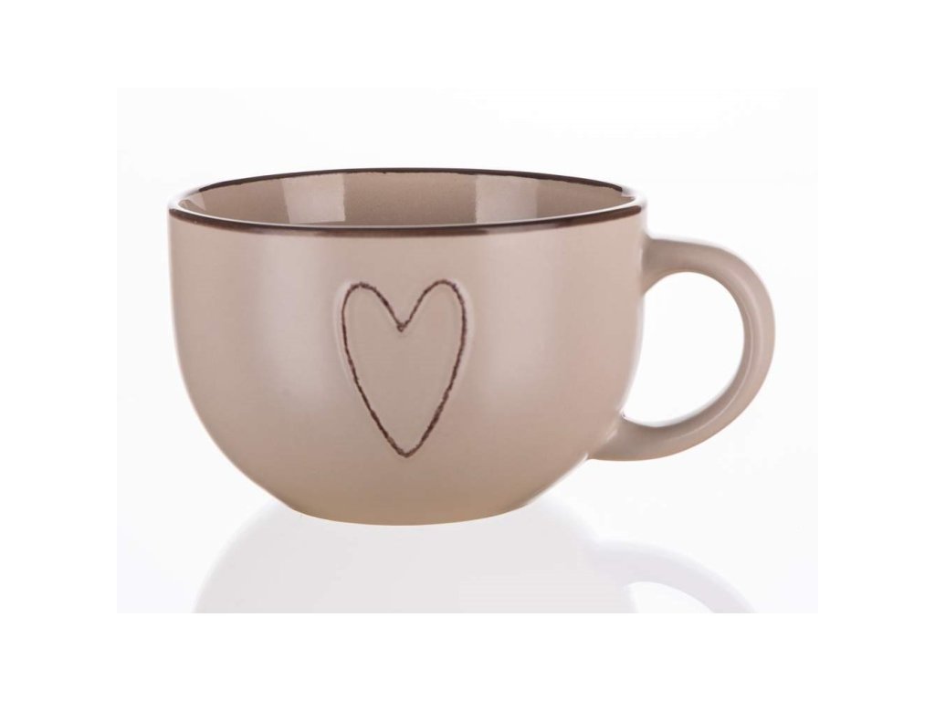 Hrnek jumbo HEART 730 ml je vyroben z keramiky, vhodný na horké i studené nápoje. Dodáván v hnědé glazuře s dekorem srdce, výška hrnku 8,6 cm, průměr horní 13 cm průměr dolní 7 cm. Hrnek lze používat do mikrovlnné trouby a mýt v myčce na nádobí.Doplňkové parametry