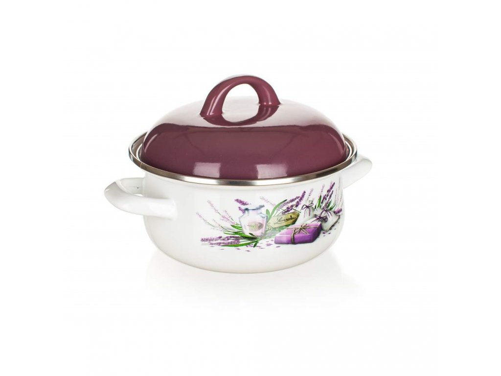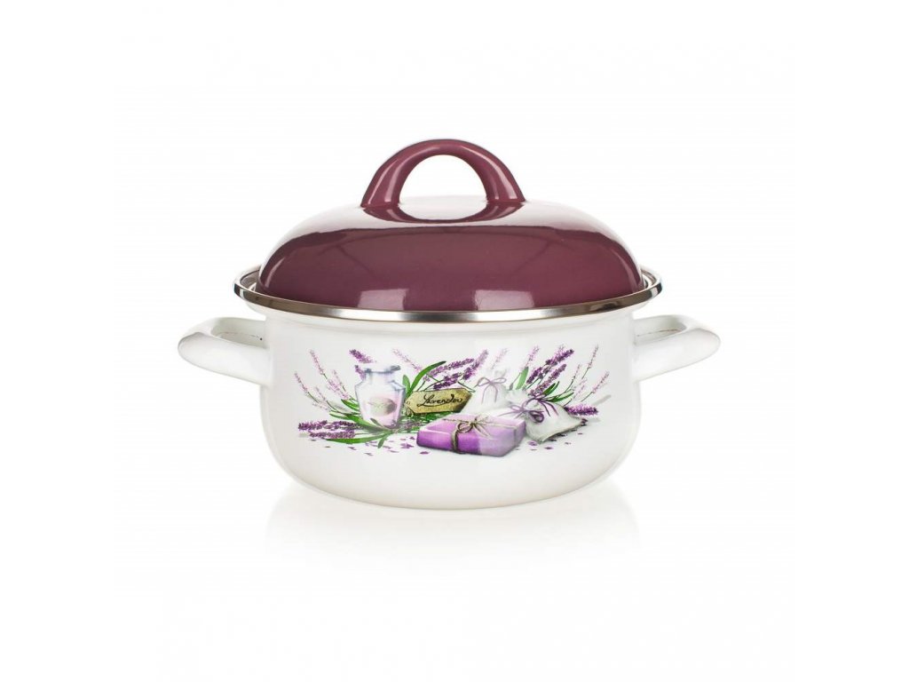 Smaltovaný kastrol LAVENDER 2,1 l, rozměry: průměr 20 cm, výška (bez poklice) 9,7 cm, vysoká poklice ve fialové barvě, kastrol s bílou glazurou a dekorem na vnější straně. Kastrol lze používat na všechny typy varných desek mimo indukce.Doplňkové parametry