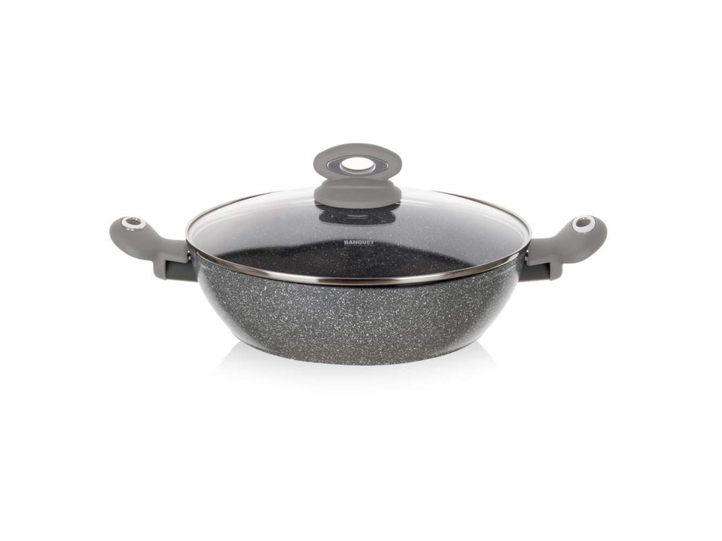 Pánev GRANITE GREY 28 x 7,5 cm s nepřilnavým povrchem je vyrobená z litého hliníku, doplněná skleněnou poklicí s aroma knobem. Vnější povrch je opatřen šedým granitovým nástřikem, má plně indukční dno a soft-touch rukojeť. Nepřilnavý povrch je velmi tvrdý a odolný proti poškrábání. Hrnec je odolný proti nárazu.- Barva: Šedá