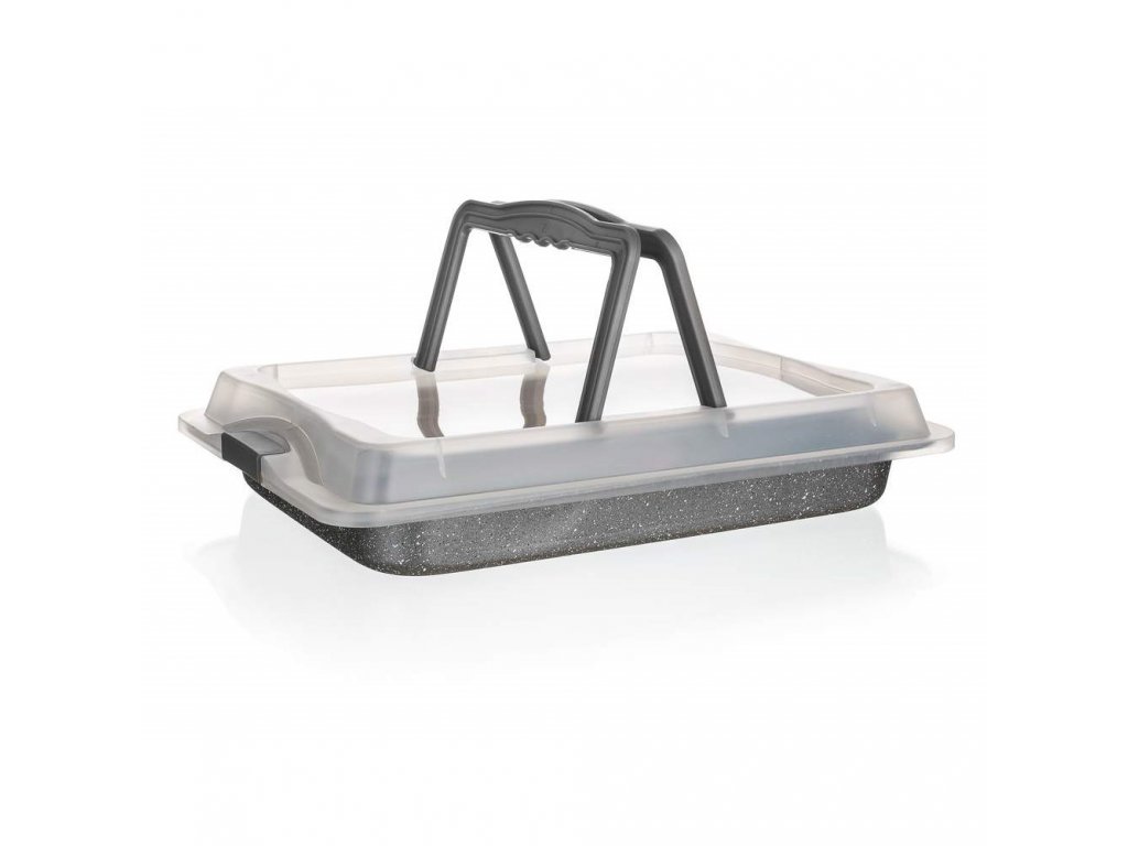 Plech s umělým víkem Granite 42x29x4,5 cm, tloušťka dna i stěn 0,4mm. Pekáče a pečící formy s nepřilnavým povrchem jsou nezbytným pomocníkem v každé kuchyni. Nepřilnavý povrch XYNFLON je vyroben na bázi PTFE (polytetrafluorethylen), je vysoce odolný, má prvotřídní antiadhézní vlastnosti a snadno se udržuje.