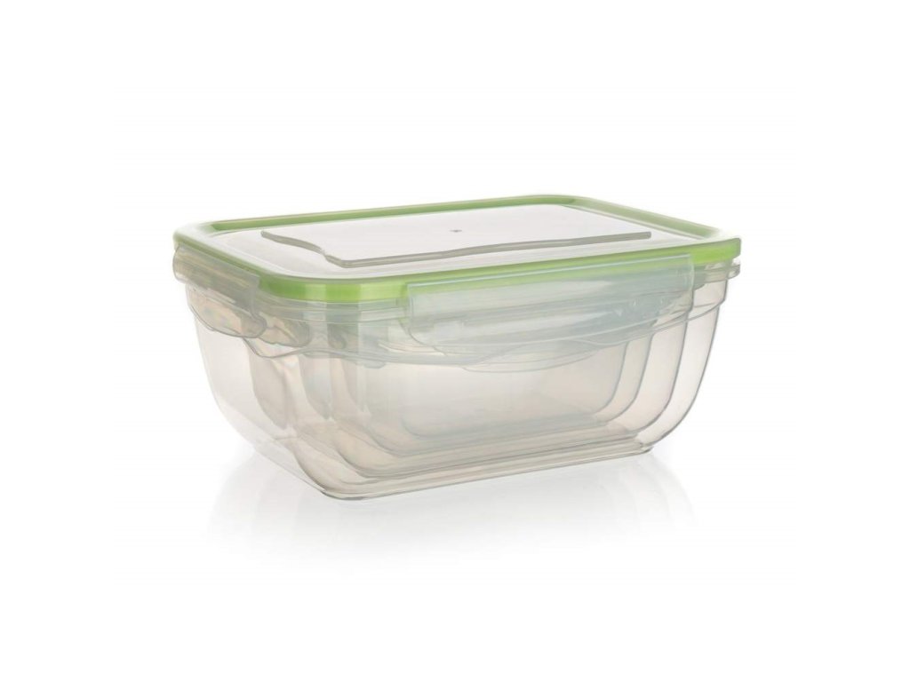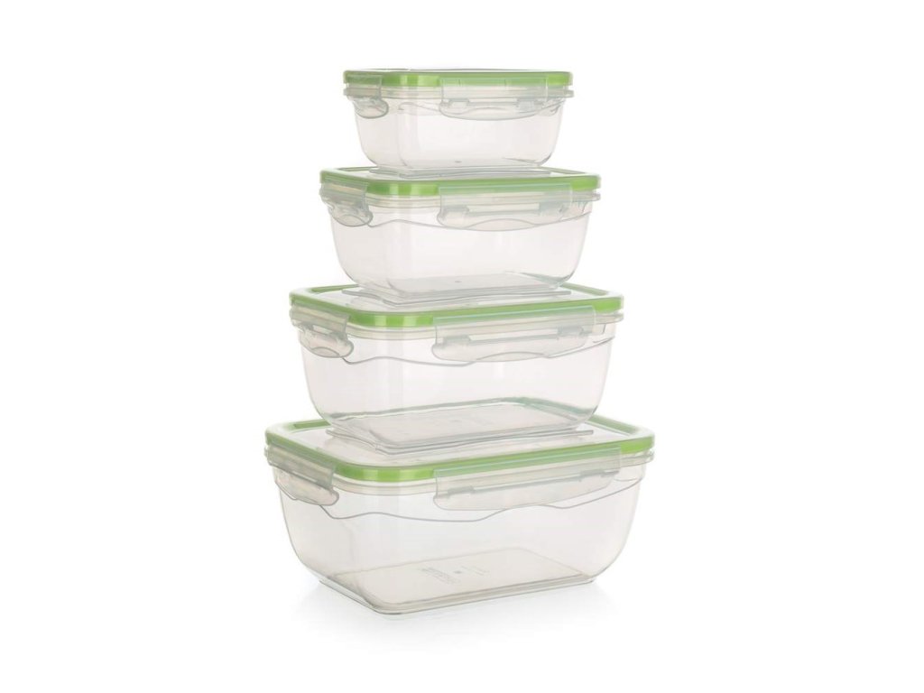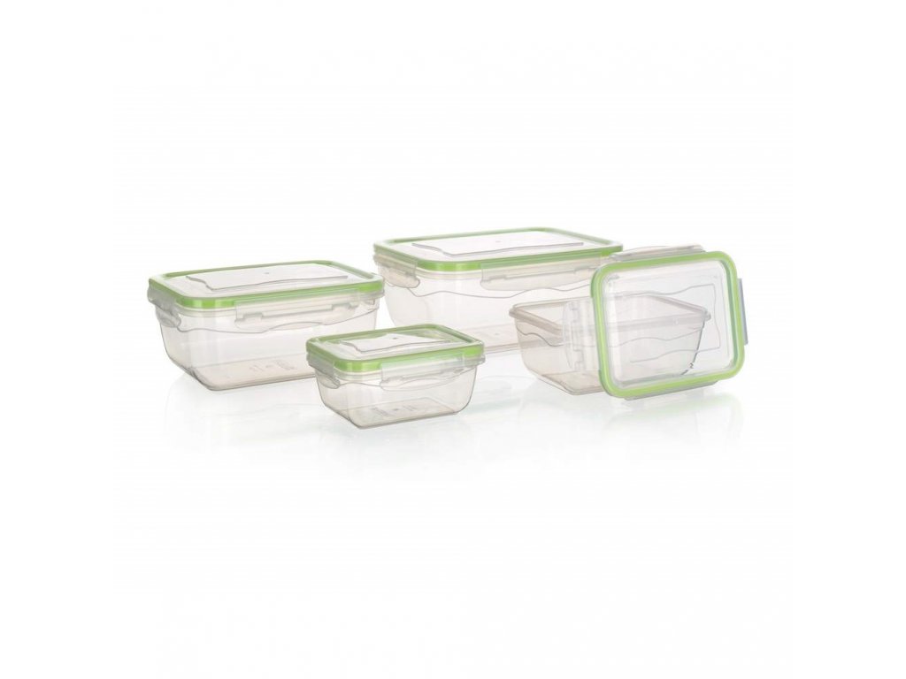 4dílná sada dóz na potraviny BANQUET obsahuje obdélníkové dózy o objemu 0,4 / 0,8 / 1,4 / 2,3 l. Vduchotěsnost dózy zajišťuje silikonové těsnění, díky kterému zůstávají potraviny dlouho čerstvé. Dóza je vyrobena z plastu, těsnění je zelené barvy. Použití v mrazničce do -25 st.C a v mikrovlnné troubě do + 96 st.C.Doplňkové parametry