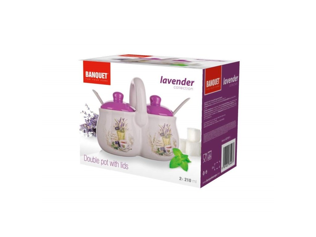 2dílná dóza se lžičkami LAVENDER, rozměry dózy: délka 14,5 cm, šířka 9 cm, výška 11,5 cm, materiál - keramika, fialovo-bílá glazura s dekorem levandule.Doplňkové parametry