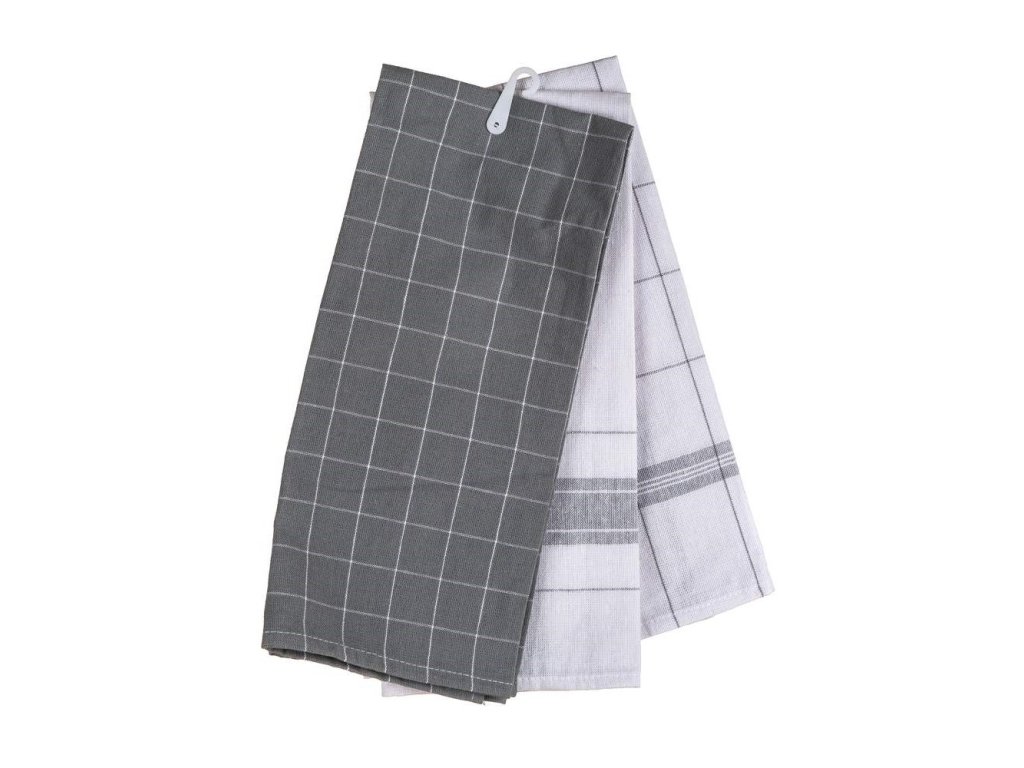 Sada bavlněných kuchyňských utěrek 3 ks LIRA ANTRACIT, kombinace šedého a bílého kára ze 100% bavlny. Sada je opatřena háčkem pro zavěšení. Hmotnost 1 ks s obrubou je 70 g.Doplňkové parametry