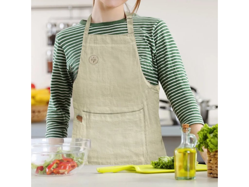 Kuchyňská zástěra ochrání oblečení při vaření, přípravě jídla v kuchyni nebo grilování na terase. V pase na zavázání, za krk pásek s přezkou – možnost nastavení délky, praktická kapsa.