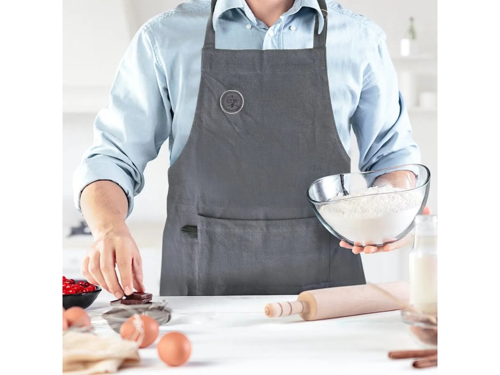 Kuchyňská zástěra ochrání oblečení při vaření, přípravě jídla v kuchyni nebo grilování na terase. V pase na zavázání, za krk pásek s přezkou – možnost nastavení délky, praktická kapsa.