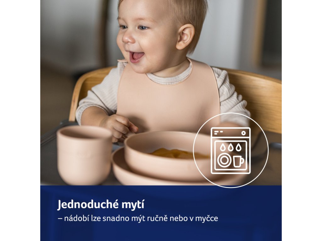Při čištění se vyvarujte používání ostrých nebo abrazivních materiálů. Opláchněte vroucí vodou. Misku a talíř nevyvařujte. Nesterilizujte. Možno mýt v myčce (max. 65 °C). Sadu nádobí lze používat v mikrovlnné troubě. Buďte opatrní při ohřívání v mikrovlnné troubě; může dojít k lokálnímu přehřátí. Vždy promíchejte ohřáté jídlo a před podáváním zkontrolujte teplotu. Doporučená maximální teplota jídla je 40 °C. Nepokládejte výrobek do horké trouby ani jej neohřívejte na plynovém/elektrickém sporáku. Nevystavujte výrobek přímému slunečnímu záření ani horku, mohlo by dojít k jeho poškození. Nenechávejte kyselá jídla v kontaktu s výrobkem po dlouhou dobu, mohlo