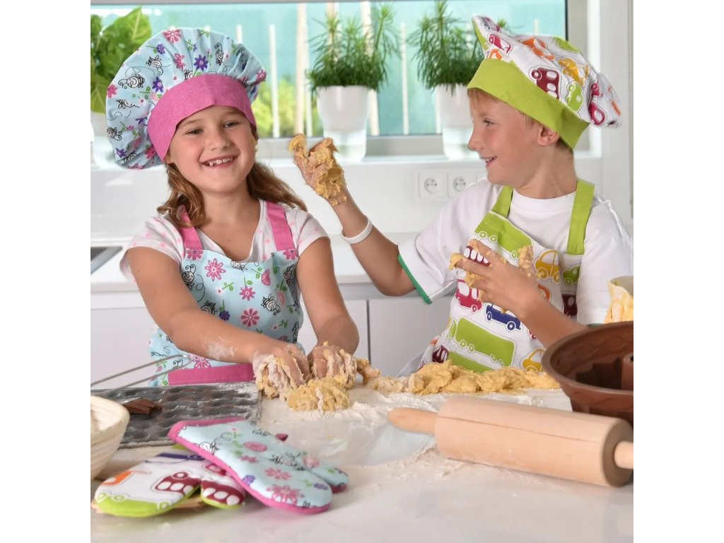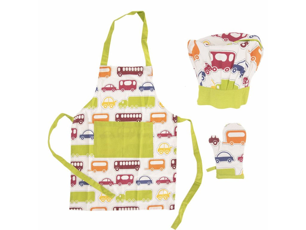 Jestliže máte doma malé kuchtíky, pořiďte jim tuto dětskou sadu obsahující bavlněnou kuchyňskou zástěru, čepici a chňapku s poutkem pro zavěšení. Děti zaujme barevný vzor aut a automobilů. Naopak rodiče zajisté ocení vázání zástěry na suchý zip, a to kolem krku i pasu.