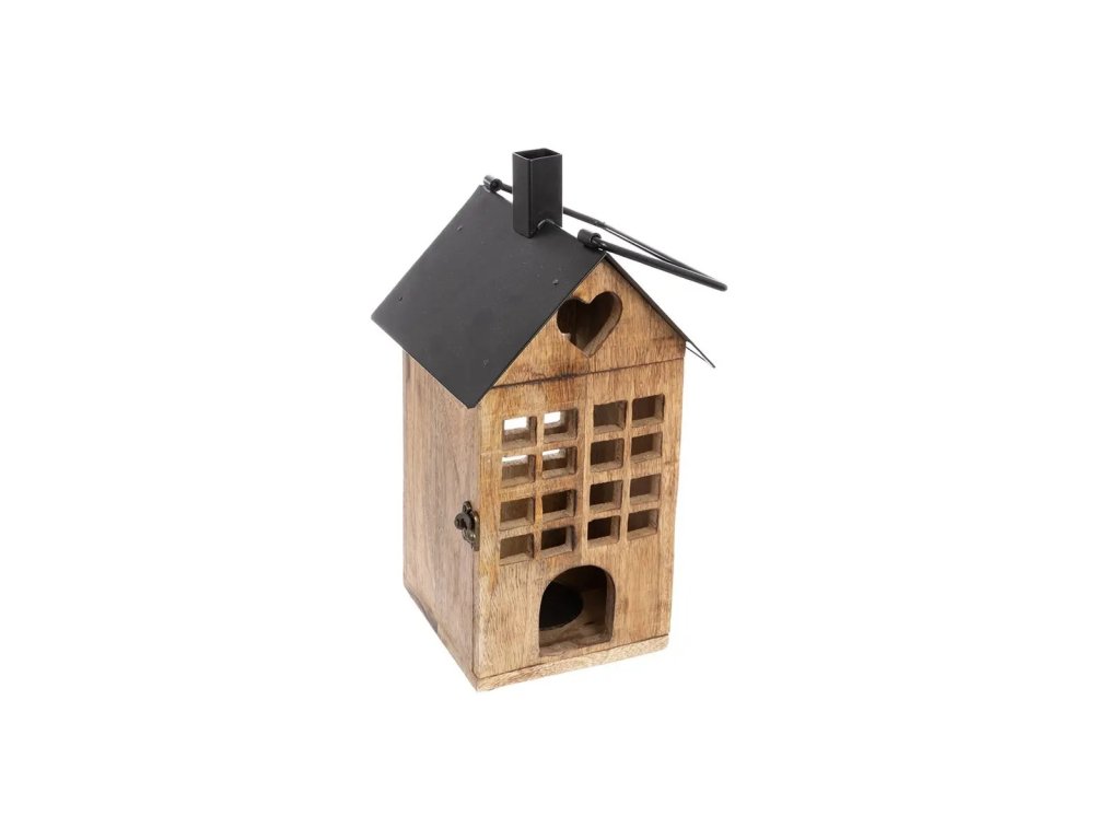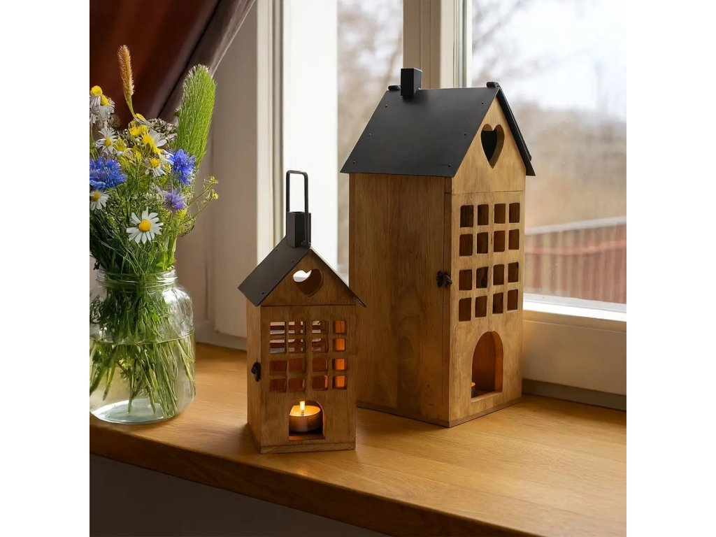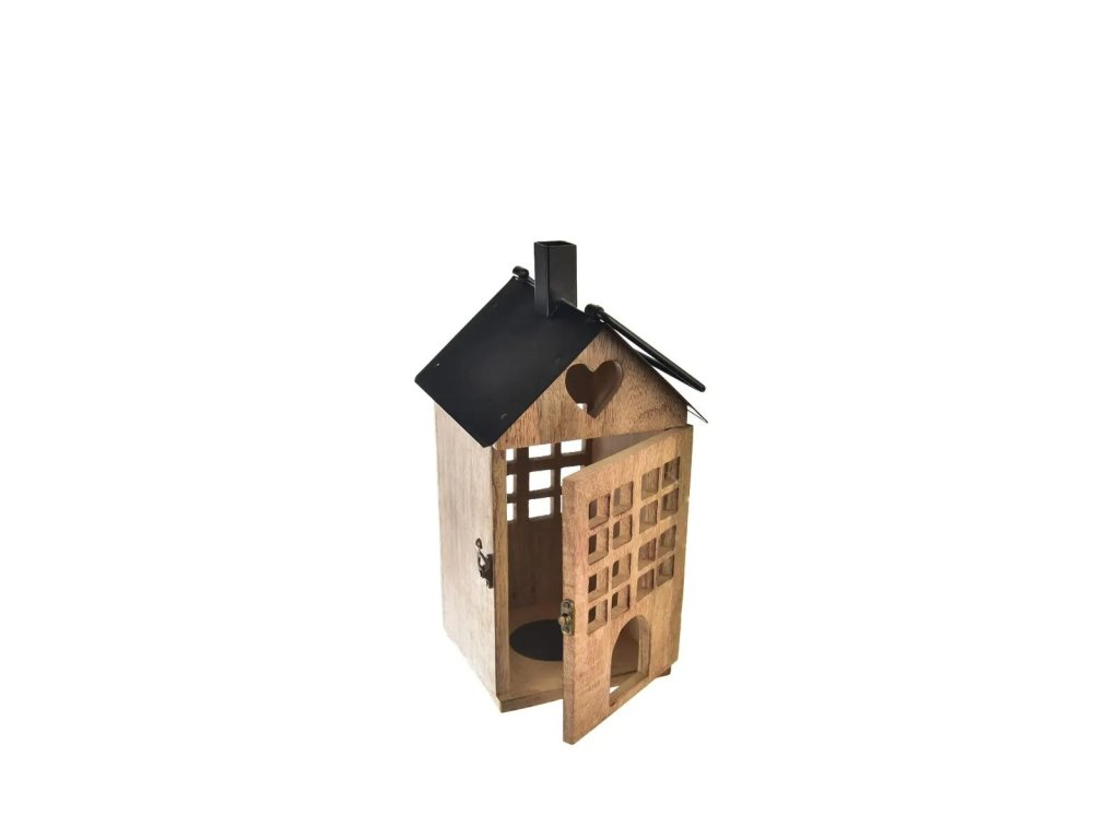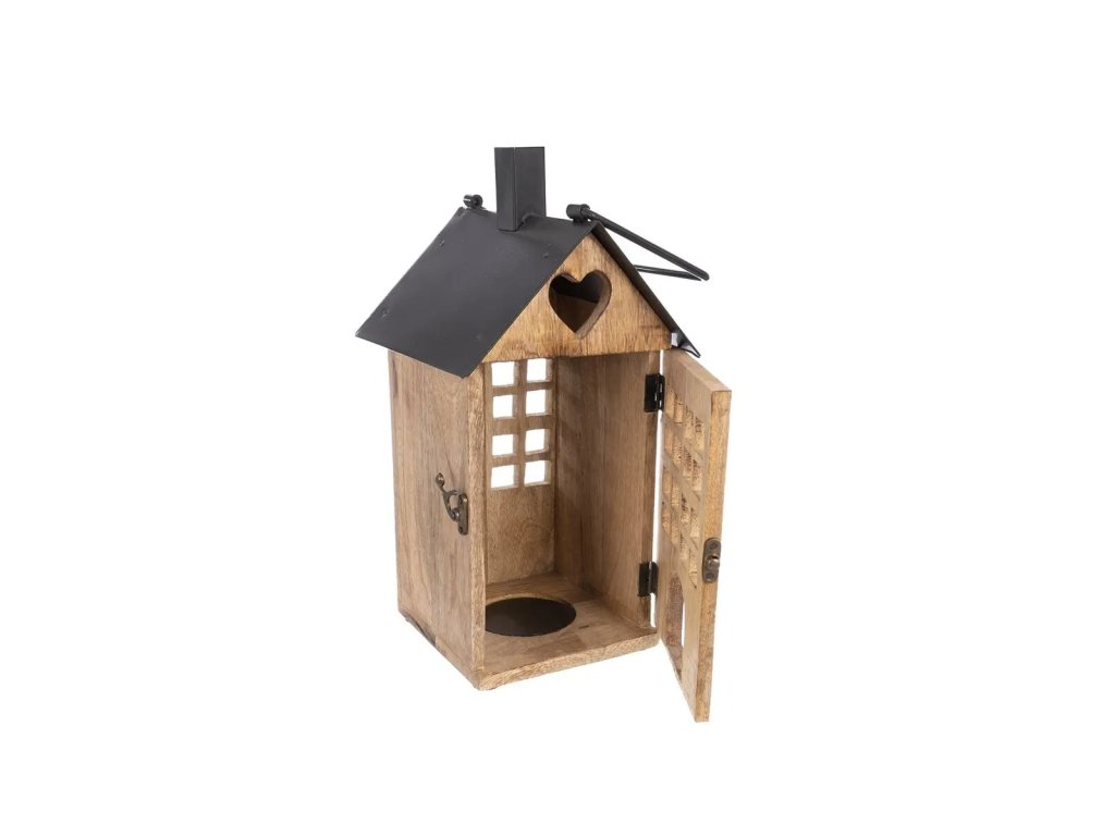 Dřevěná lucerna z kvalitního mangového dřeva vnese do vašeho domova hřejivou a útulnou atmosféru. Její originální design ve tvaru domečku s jemně vyřezávanými okénky vytváří po zapálení svíčky nádhernou hru světla a stínů. Kovová stříška dodává lucerně rustikální nádech, zatímco srdíčkový výřez na přední straně přináší romantický detail, který okamžitě upoutá pozornost.
