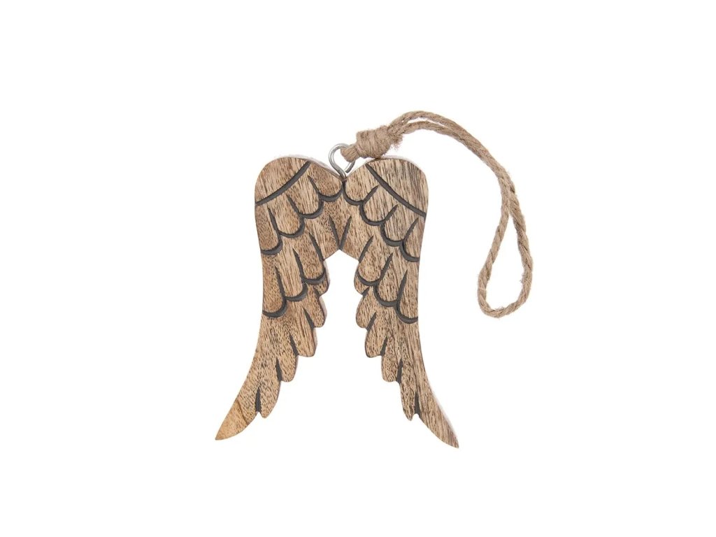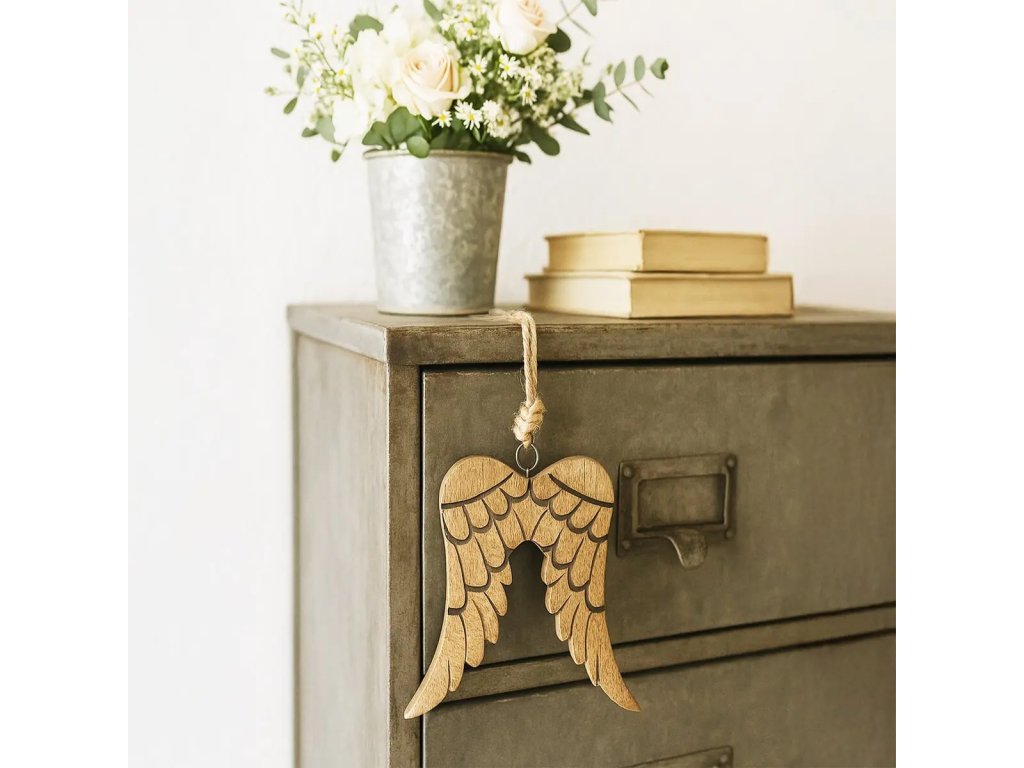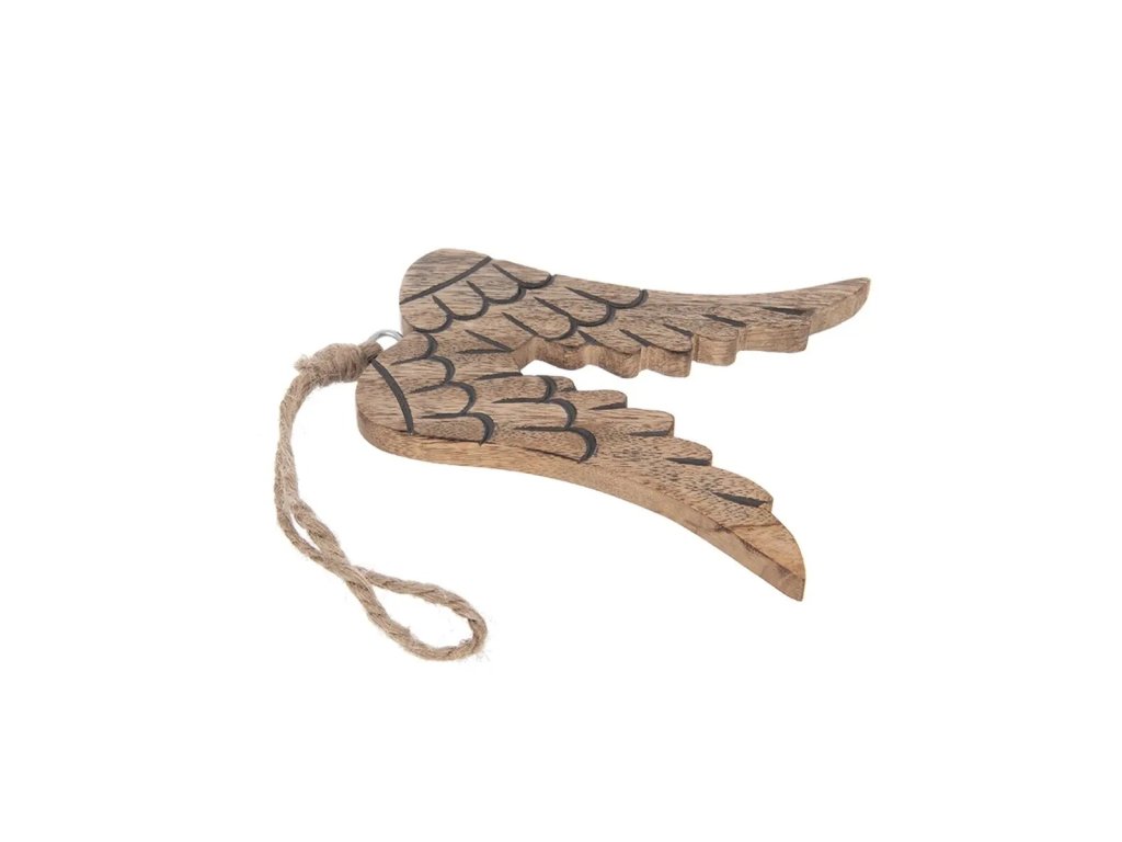 Dekorace ANDĚLSKÁ KŘÍDLA na zavěšení ozdobí vaši domácnost nejen v období Vánoc, využít ji můžete po celý rok. Vhodná také jako dárek. Materiál: mangové dřevo, kov, juta. Rozměry: š. 11,8 cm, v. 13,8 cm, v. s provazem 29,5 cm.