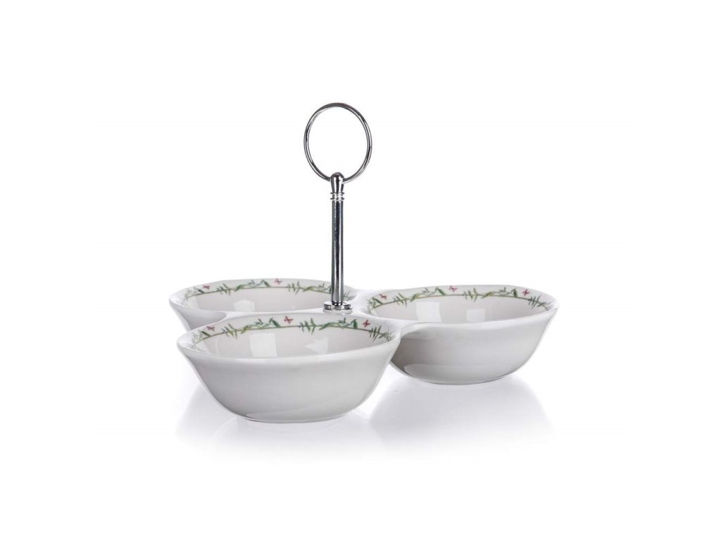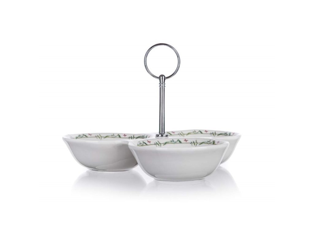 Miska SPRING dělená na 3 části je vyrobena z keramiky s dekorem květin. Vhodná pro servírování oříšků, cukrovin a dlaších pochutin. Miska je vybavena úchytem pro lepší manipulaci. Celková výška s úchytem 15 cm, průměr jedné misky 10,5 cm.Doplňkové parametry