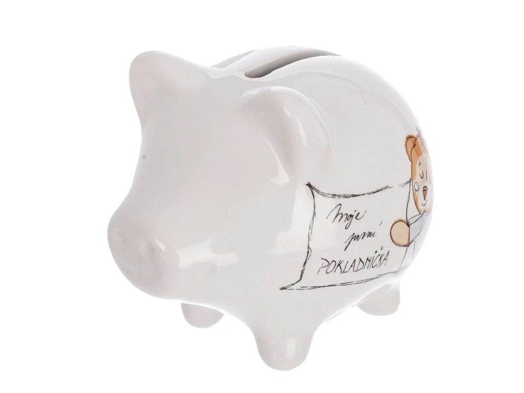 Bílá keramická pokladnička ve tvaru prasátka s nápisem „Moje první pokladnička“ je ideálním místem pro uchování prvních úspor vašeho dítěte a připomínkou jeho prvních krůčků k samostatnosti. Každá vložená korunka tak získává svůj vlastní příběh. Díky jemnému designu a kvalitnímu keramickému provedení se pokladnička stává nejen praktickým, ale i krásným dárkem vhodným k narození dítěte, křtinám nebo narozeninám. Zespodu je opatřena praktickou zátkou pro snadné vyjmutí úspor.