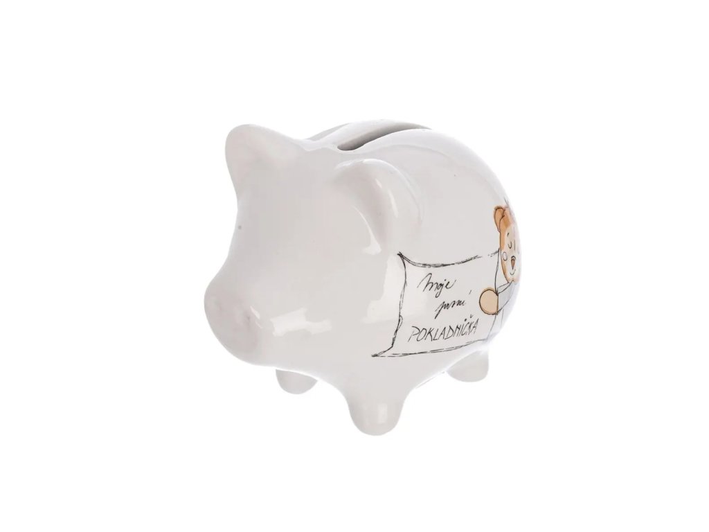 Bílá keramická pokladnička ve tvaru prasátka s nápisem „Moje první pokladnička“ je ideálním místem pro uchování prvních úspor vašeho dítěte a připomínkou jeho prvních krůčků k samostatnosti. Každá vložená korunka tak získává svůj vlastní příběh. Díky jemnému designu a kvalitnímu keramickému provedení se pokladnička stává nejen praktickým, ale i krásným dárkem vhodným k narození dítěte, křtinám nebo narozeninám. Zespodu je opatřena praktickou zátkou pro snadné vyjmutí úspor.