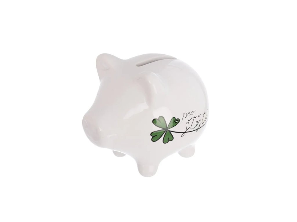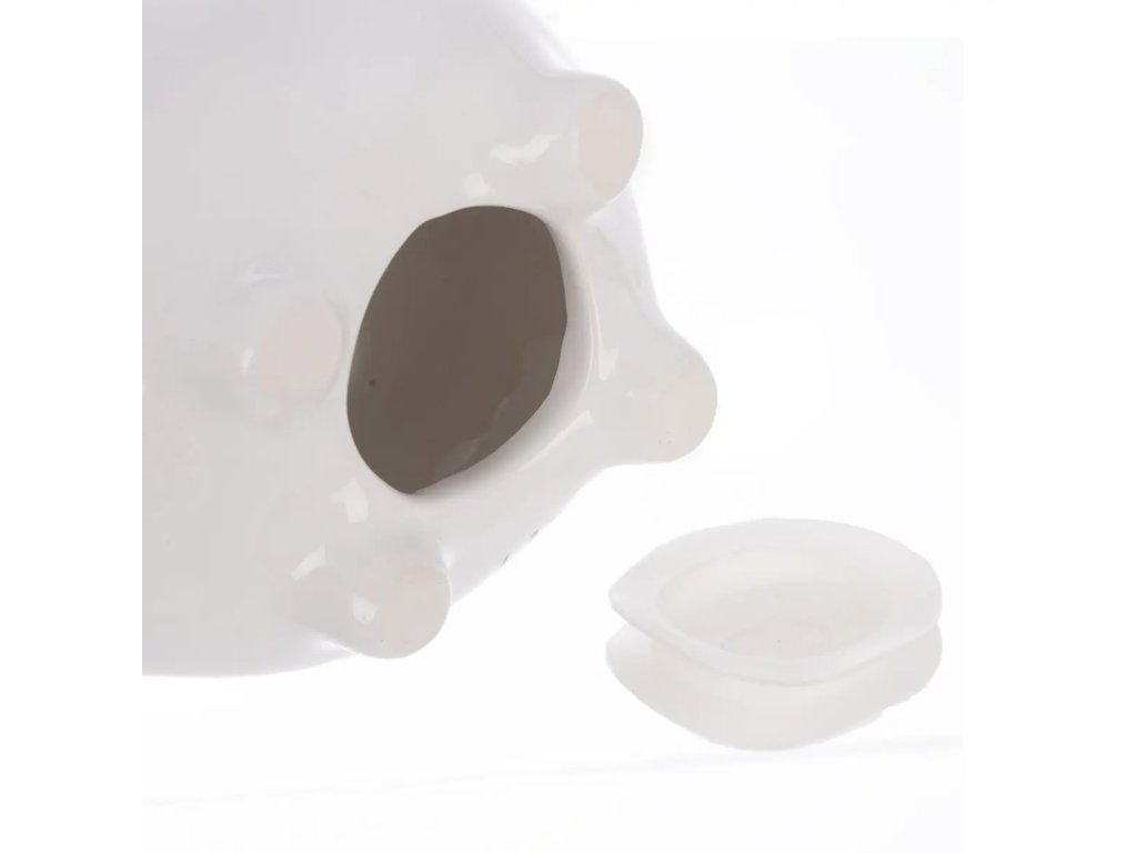 Bílá keramická pokladnička ve tvaru prasátka s nápisem „Pro štěstí“ je praktickým a zároveň stylovým doplňkem, který vám poslouží jako malý talisman a motivace k šetření na sny, jež stojí za to. I když štěstí si koupit nelze, můžete si na něj postupně našetřit! Díky jednoduchému a čistému designu se pokladnička hodí do každého interiéru a zároveň je ideálním dárkem pro každého, kdo si zaslouží kousek štěstí navíc. Zespodu je opatřena praktickou zátkou pro snadné vyjmutí úspor.