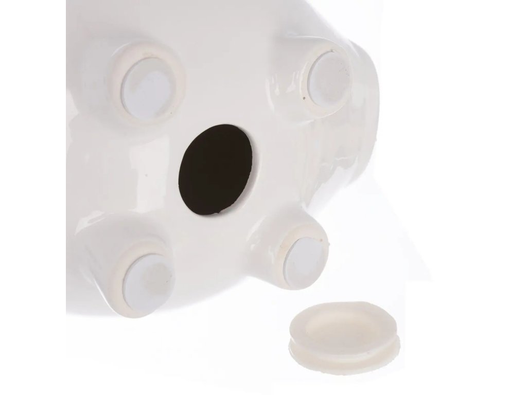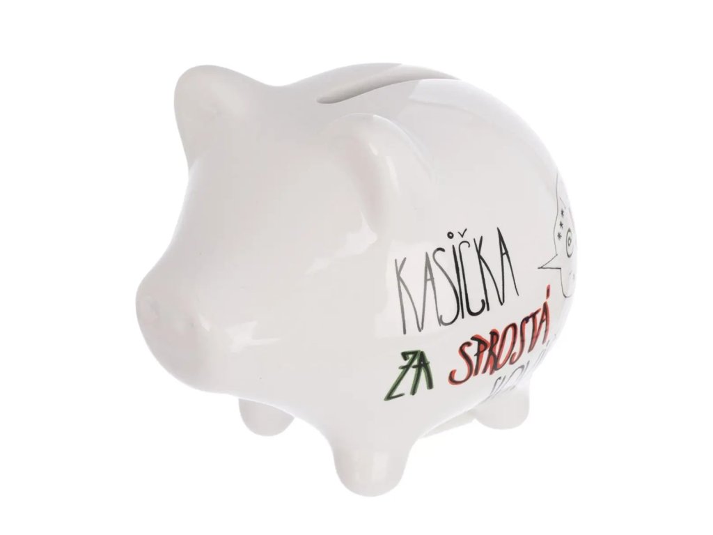 Bílá keramická pokladnička ve tvaru prasátka s nápisem „Kasička za sprostá slovíčka“ přináší do domácnosti i kanceláře zábavu a motivuje k lepšímu slovníku. Každé peprné slůvko znamená příspěvek do kasičky, což z ní činí ideální doplněk pro domácí pobavení, firemní prostředí nebo jako originální dárek pro kamaráda s proříznutým jazykem. Díky svému hravému a stylovému designu pobaví a rozesměje každého. Zespodu je opatřena praktickou zátkou pro snadné vyjmutí úspor.