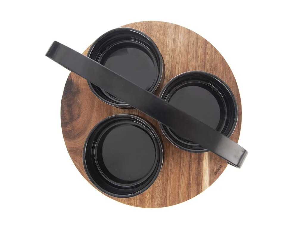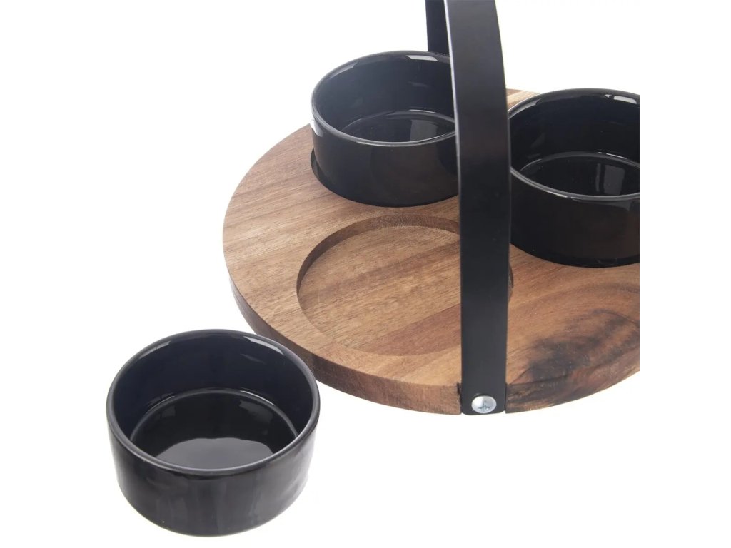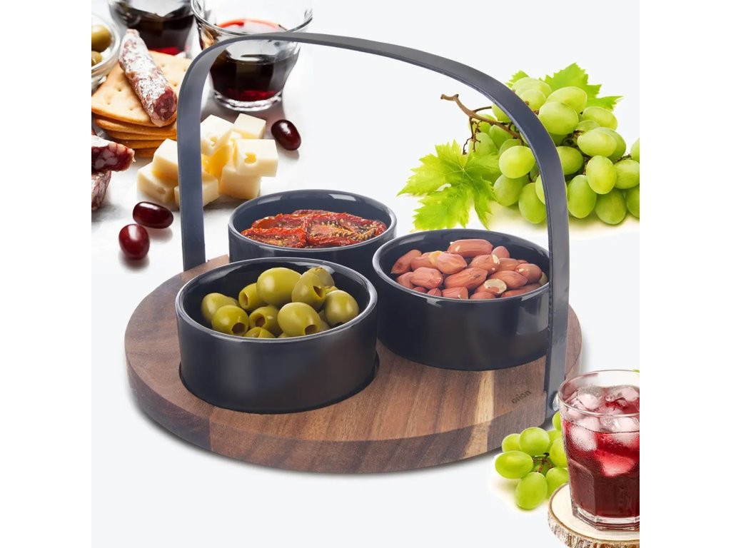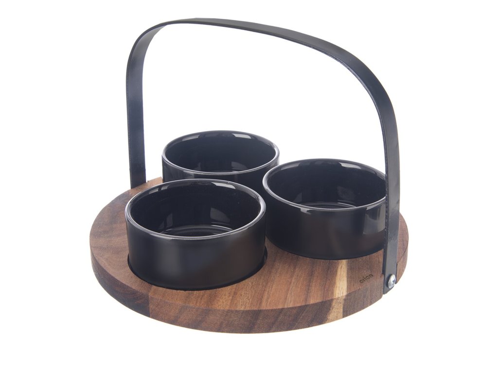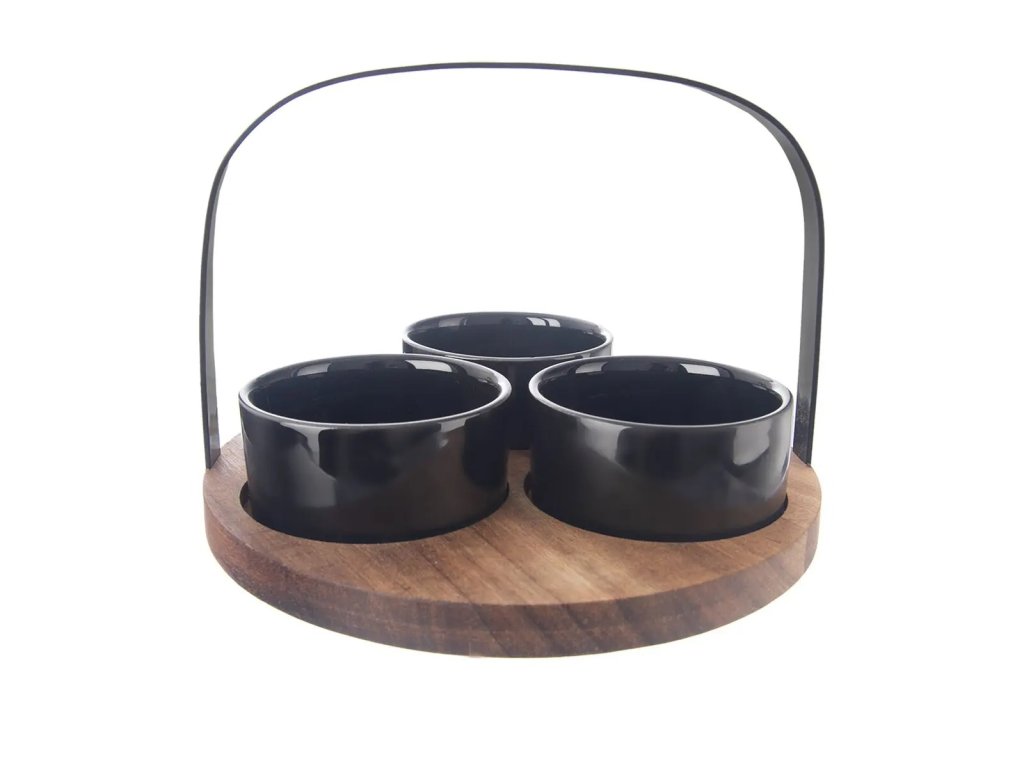 Servírovací set tří kulatých misek na tácku s uchem využijete k servírování pohoštění rodině nebo hostům. Vhodné na olivy, uzeniny, sýry, pesta, oříšky, zeleninu... Praktické ucho pro snadné přenášení. Skvěle se hodí doma i na terase, případně v restauracích a bistrech...