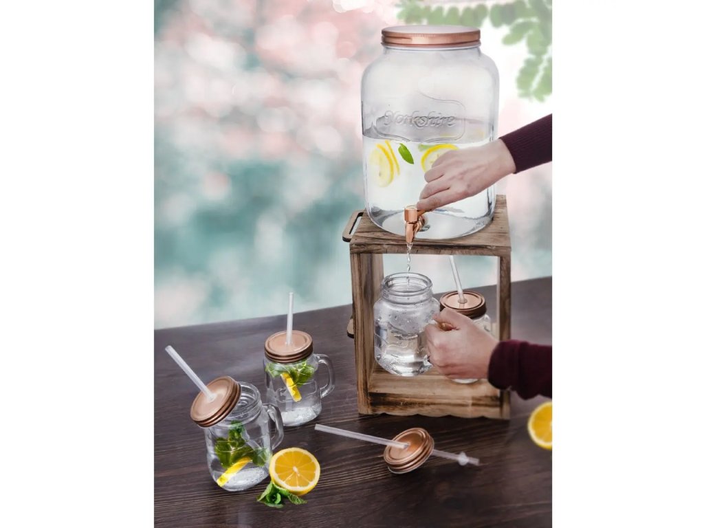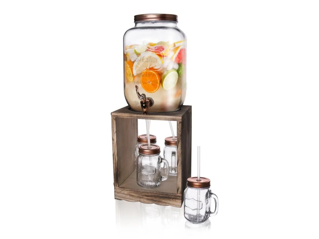 Stylová sada, která se hodí na narozeninové oslavy, svatební hostiny či zahradní grilovačky. Obsahuje velký skleněný džbán o objemu 8,8 l, jenž můžete naplnit vodou s mátou, Aperolem Spritzem, citrónovou limonádou nebo bezinkovou šťávou. V jeho spodní části je kohoutek sloužící k dávkování nápoje. Výhodou nádoby je široké hrdlo, které oceníte například při jejím mytí.