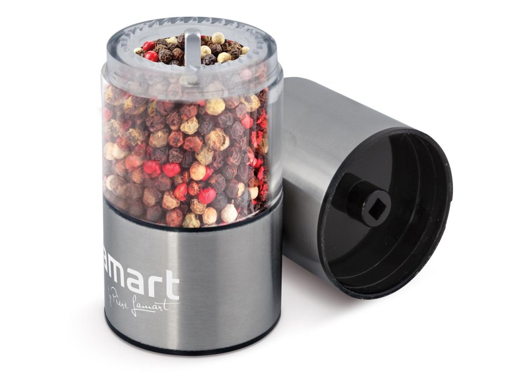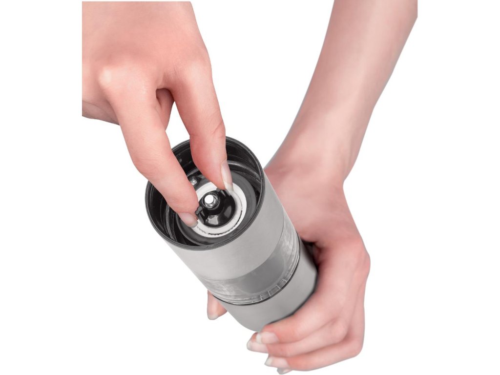 Mlýnek na koření/pepř/sůl je vyroben z nerezavějící oceli a plastu s keramickým mlecím mechanismem s nastavitelnou hrubostí mletí. Průhledná doplňovací komora umožňuje sledovat naplněnost mlýnku. Ovládání mlýnku za pomocí otáčecího mechanismu.