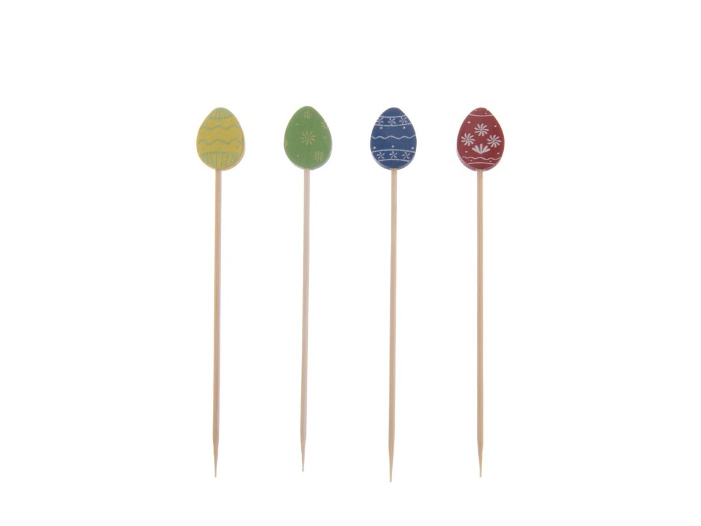 Bambusová napichovátka s barevnou ozdobou ve tvaru VAJÍČKA využijete při servírování drobného slaného nebo sladkého pohoštění velikonočním koledníkům, při oslavách, na párty... Ozdobí jednohubky, muffiny, dortíky, olivy, kousky sýra... Sada 20 ks. Mix barev.