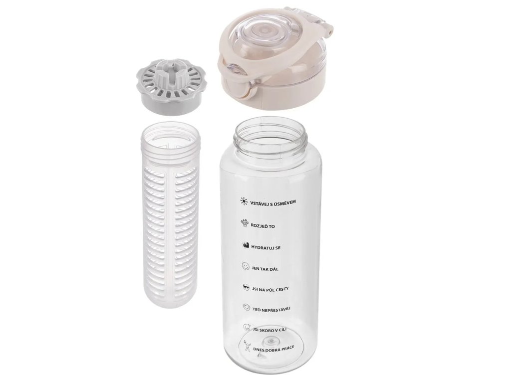 Láhev s pítkem, filtrem na ovoce a bylinky, víčkem a uchem na zavěšení. Vhodná do školy, na výlet, na sport, na studené i teplé nápoje… Do filtru můžete vložit citrusové ovoce, mátu, meduňku, okurek… Nápoj bude ochucený, osvěžující, ale pít budete čisté nápoje bez dužiny, lístků… Dekor s vyznačenou motivační odměrkou vám zaručí dodržování pitného režimu. Díky ní vypijete dostatek tekutin během dne a to průběžně.Plast TRITAN nejen že neobsahuje plastifikátory, ale má i řadu jiných výhod, které z něj činí populární náhražku skla. Je vysoce odolný vůči nárazům, takže je vhodný nejen pro každodenní použití například do školy, do práce či na turistiku, obdivuhodná je jeho průhlednost a čistota materiálu, lehkost, nepřejímá žádné chutě ani vůně, vydrží nízké i vysoké teploty, může se mýt v myčce na nádobí tedy je snadná údržba, a především neobsahuje žádné zdraví škodlivé látky, odpovídá požadavkům na ochranu životního prostředí a FDA (Úřad pro kontrolu potravin a léčiv).