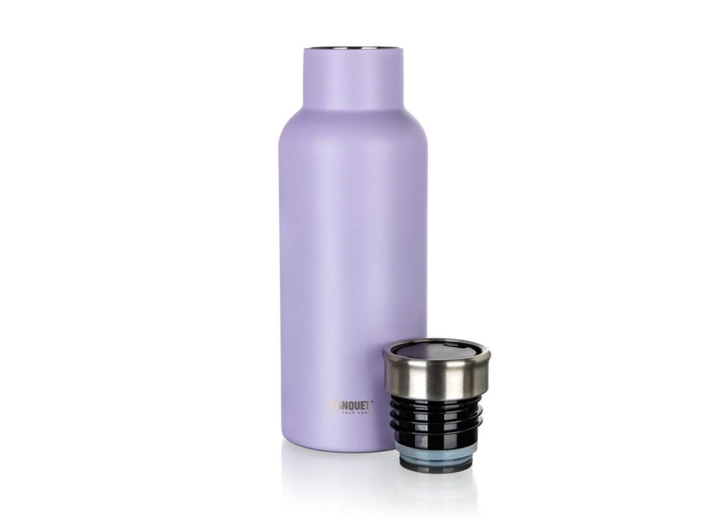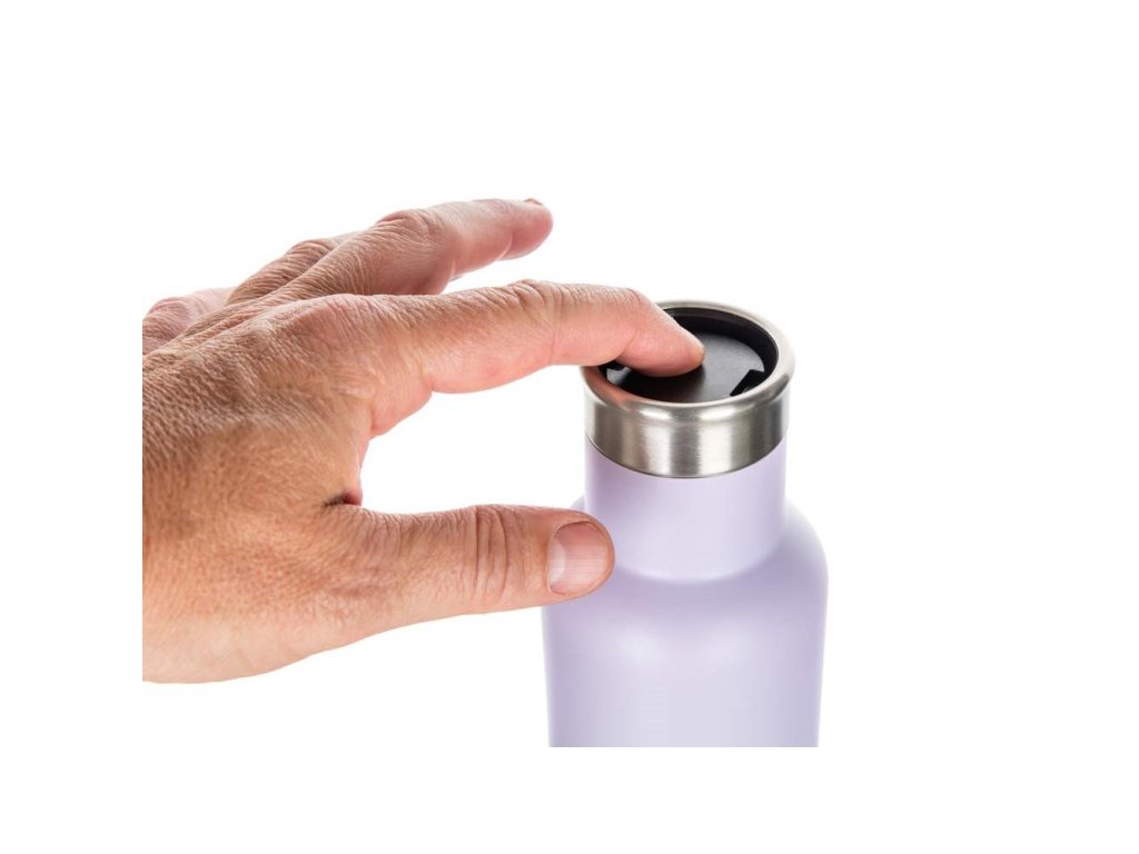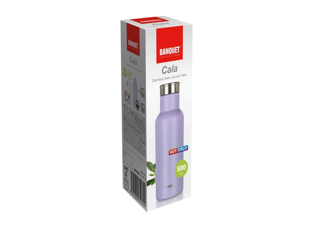 Dvoustěnná cestovní termoska CALA v barvě lila, je vhodná na teplé i studené nápoje. Vnější část je vyrobena z nerezu 201, vnitřní část z nerezu 304 a víčko z plastu. Využitelný objem je 450 ml. Tělo termosky je vakuové, udrží tak nápoje déle horké či studené. Doporučujeme uchovávat ve svislé poloze. Ve víčku je kulatá pojistka - termo-bezpečnostní uzávěr, díky kterému je možné nalévání nápoje bez odšroubování víčka, stačí jednoduše zatlačit pojistku.