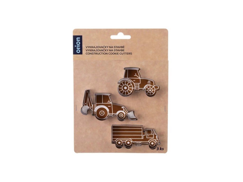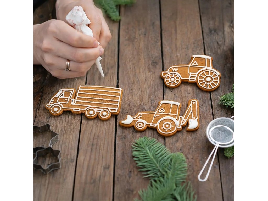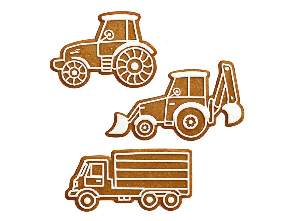 Sada vykrajovaček vám umožní vytvořit si doma voňavé perníčky. Sada obsahuje 3 tvary: traktor, bagr a nákladní auto. Součástí balení je recept.