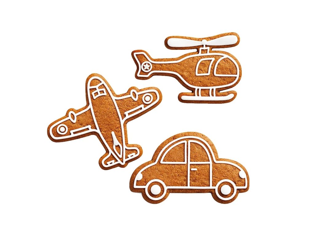 Sada vykrajovaček vám umožní vytvořit si doma voňavé perníčky. Sada obsahuje 3 tvary: vrtulník, letadlo a auto. Součástí balení je recept.