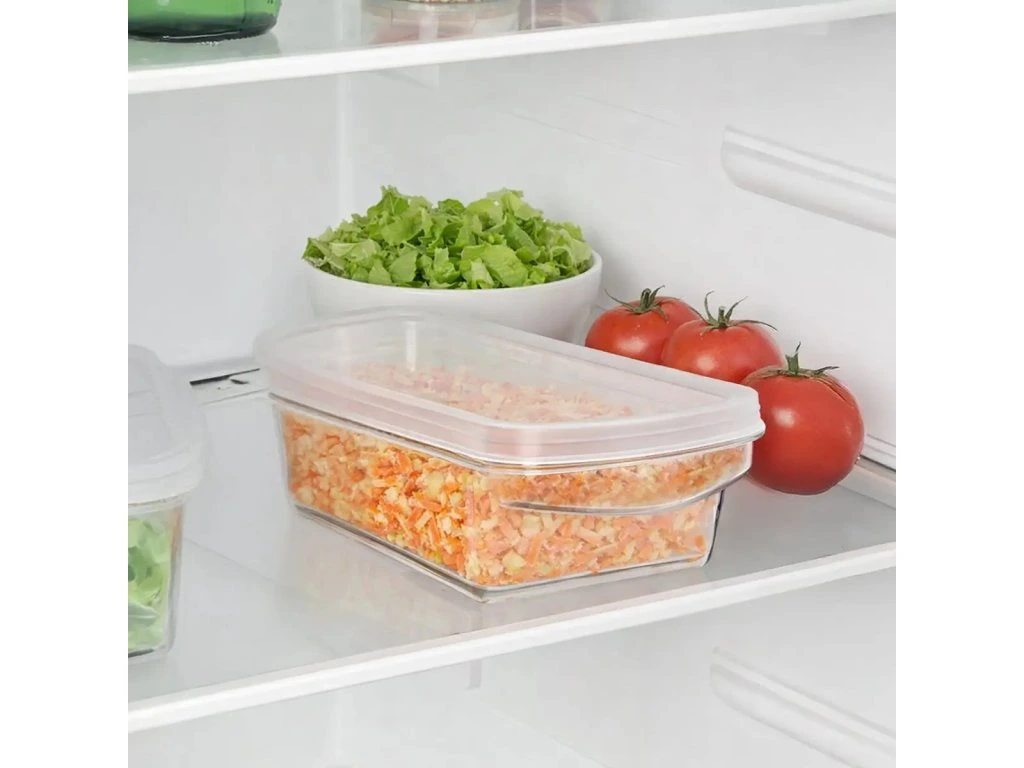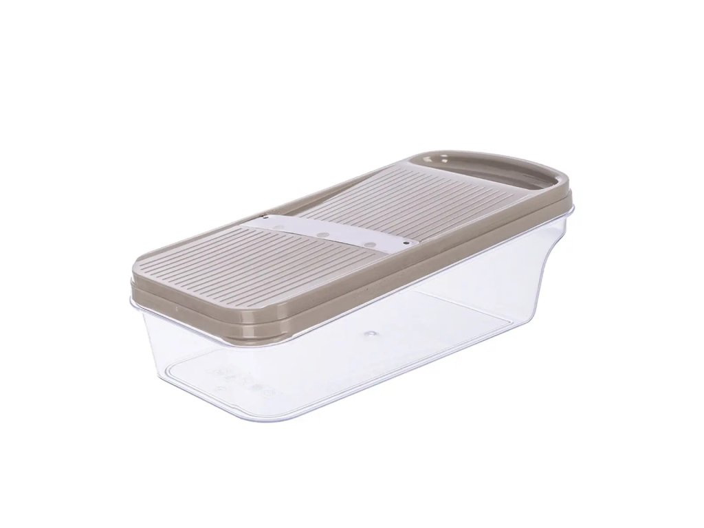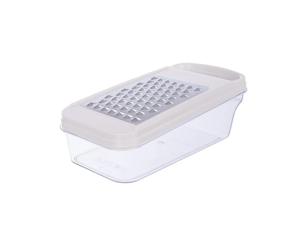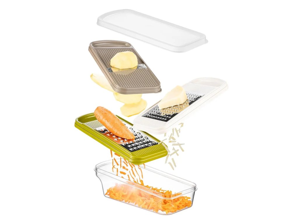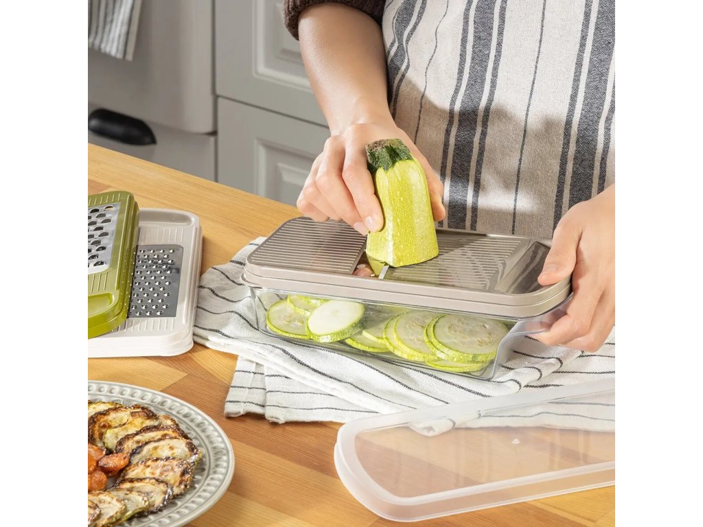 Nastrouhané potraviny se shromažďují přímo v zásobníku, který lze jednoduše uzavřít víkem a uložit například do lednice, aniž by bylo nutné obsah přesypávat. Ergonomické a snadné uchycení zajišťuje pohodlnou a bezpečnou manipulaci během krájení, což oceníte při každodenním používání. Výrobek je BPA-free.