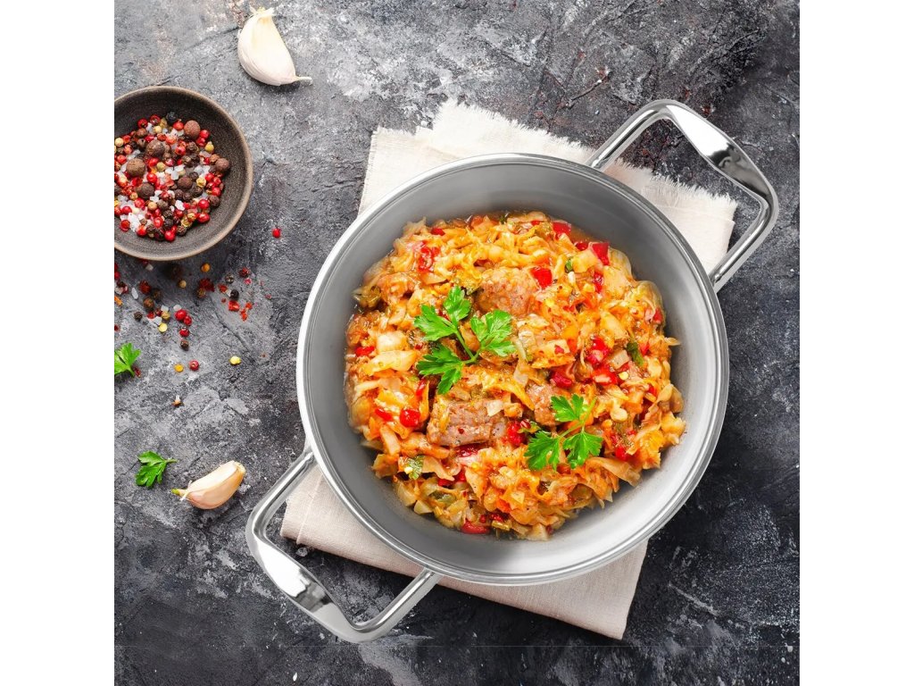 - Materiál: nerezová ocel 304, hliník (sendvičové dno) + poklice - sklo, nerez, silikon.