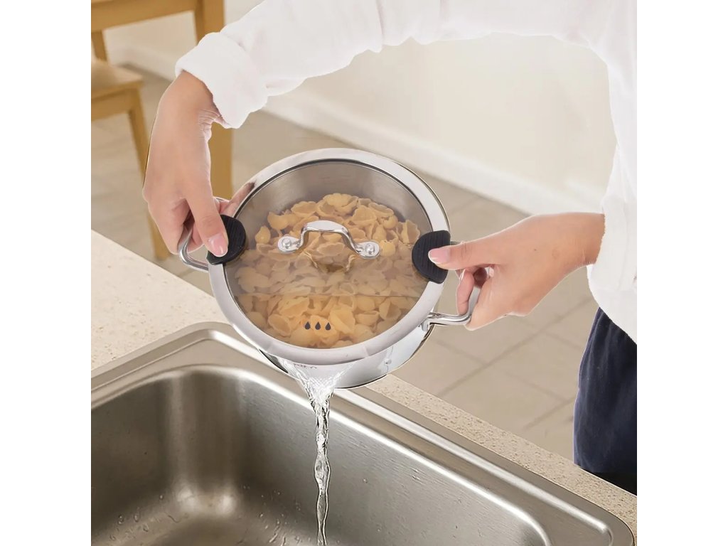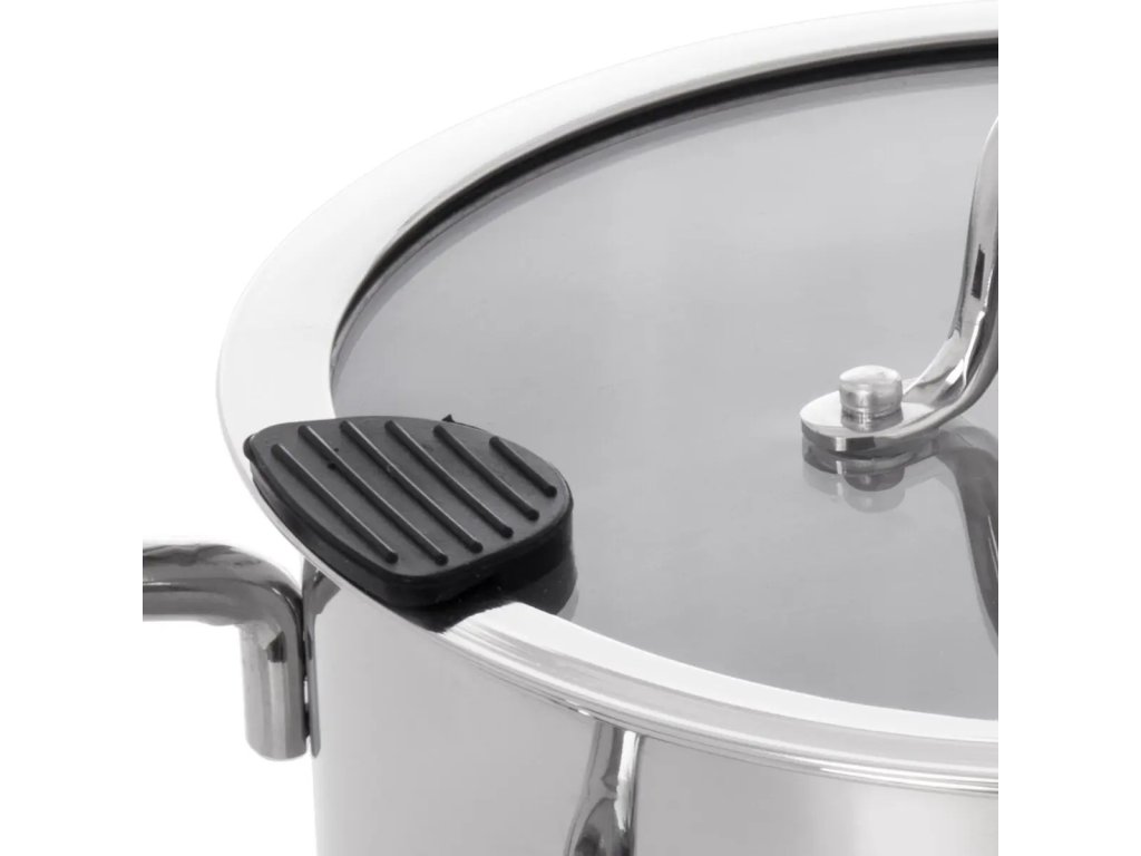 Nerezový hrnec je vybaven skleněnou poklicí s výlevkou, která slouží k bezpečnému a pohodlnému vypouštění vody či cezení. Výlevka zároveň umožňuje únik páry během vaření. Poklice obsahuje silikonové prvky, které usnadňují cezení bez potřeby použití utěrky nebo jiných ochranných pomůcek.