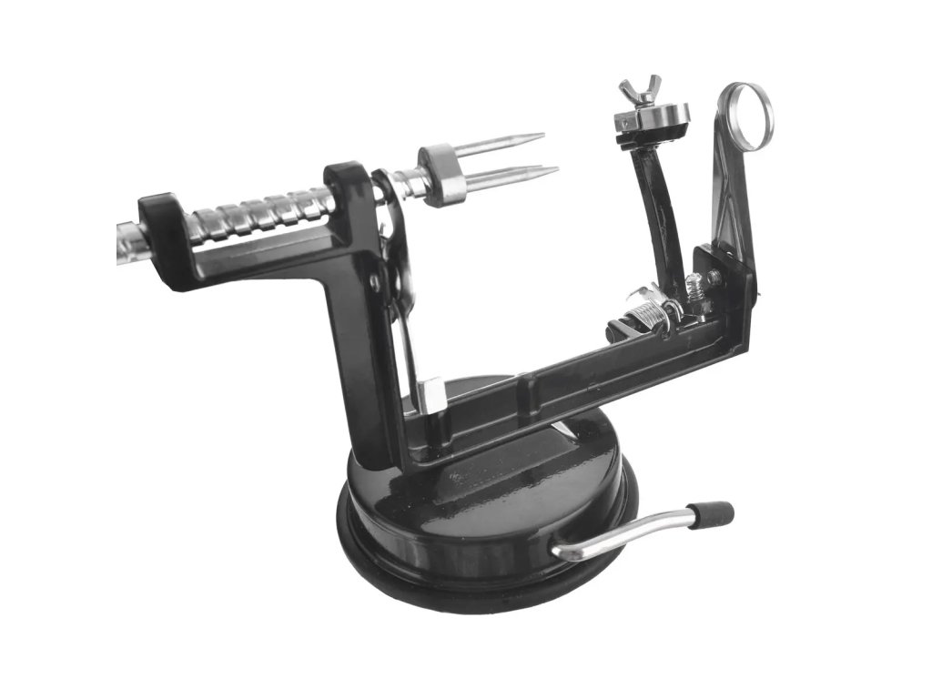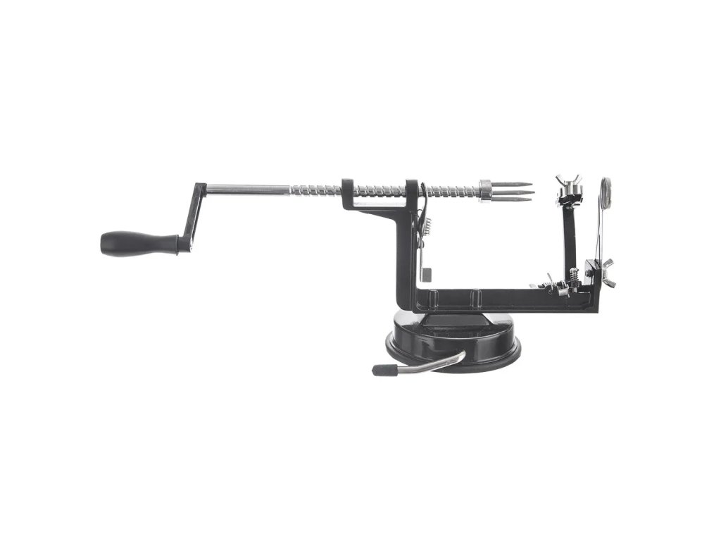 Mechanický strojek jablka okrájí, vykrojí jadřinec a zároveň jablko nakrájí do tvaru spirály. Povolením šroubku můžete sklopit přední nůž, tak vyřadíte z provozu části, které zajišťují vykrojení jadřince a krájení spirál a strojek tak využíváte pouze na okrájení jablek. Nebo můžete vyřadit z provozu/odklopit okrajovací břit a jablko tak zůstane neokrájené, ale vyjmete jadřinec a nakrájíte jej do spirály.