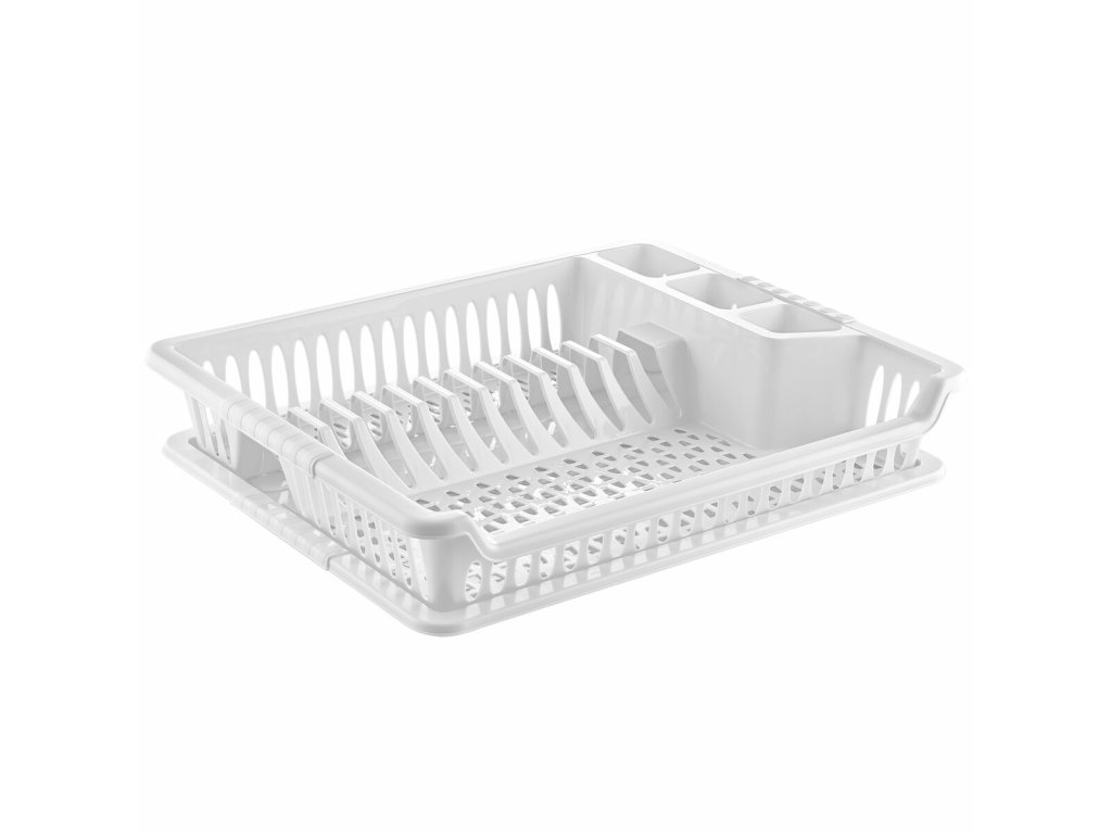 Odkapávač na nádobí s tácem. Členěný - sekce na příbory, talíře a na ostatní nádobí. Materiál: plast. Barevné varianty. Rozměry: 45x37x8,5 cm.Doplňkové parametry