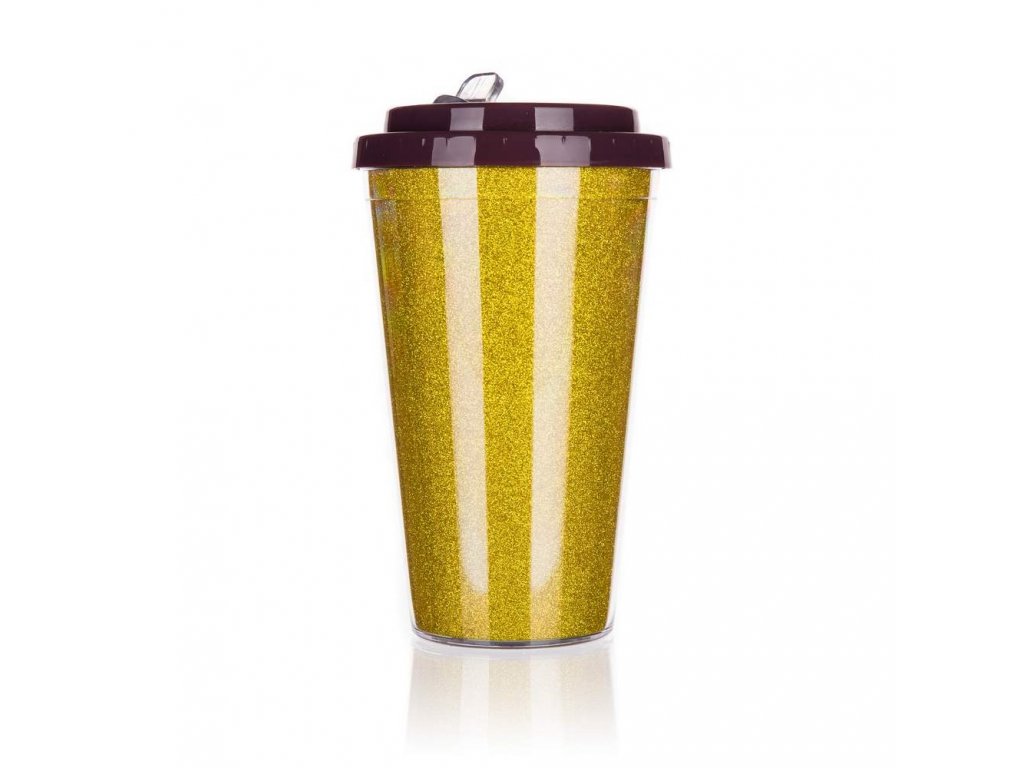 Cestovní dvoustěnný plastový hrnek GLITTERS ve zlaté barvě, objem 500 ml, je vhodný na teplé a studené nápoje. Hrnek není určen pro nápoje o teplotě vyšší než 60 st. C. Díky dvoustěnnému provedení udrží nápoj delší dobu v požadované teplotě. Hrnek je celoplastový - tělo hrnku je z PS, šroubovací víčko z PP se silikonovým těsněním a pítko z AS. Hrnek není vhodný do myčky.Doplňkové parametry