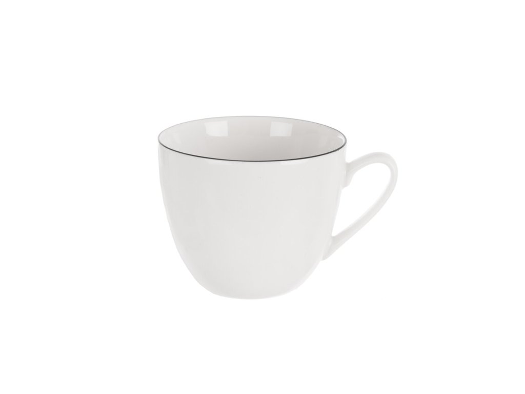 Elegantní porcelánový hrnek má hladký bílý povrch a je zdoben jemnou černou linkou po okraji, která podtrhuje jeho vytříbený vzhled. Ideální na cappuccino – stylový doplněk pro každého milovníka kávy.