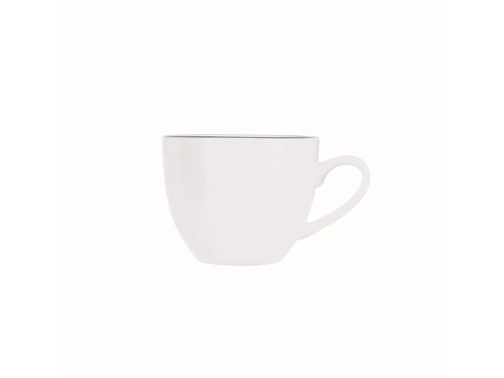 Elegantní porcelánový hrnek má hladký bílý povrch a je zdoben jemnou černou linkou po okraji, která podtrhuje jeho vytříbený vzhled. Ideální na espresso – stylový doplněk pro každého milovníka kávy.