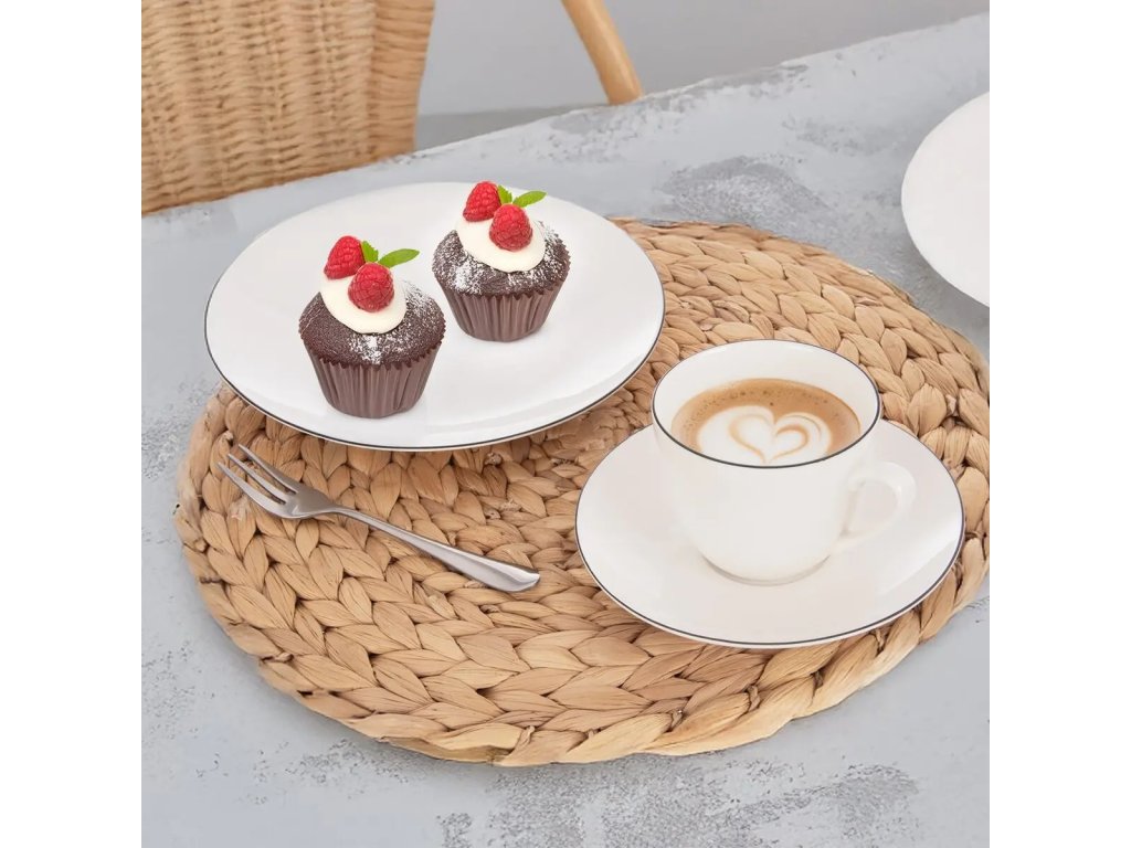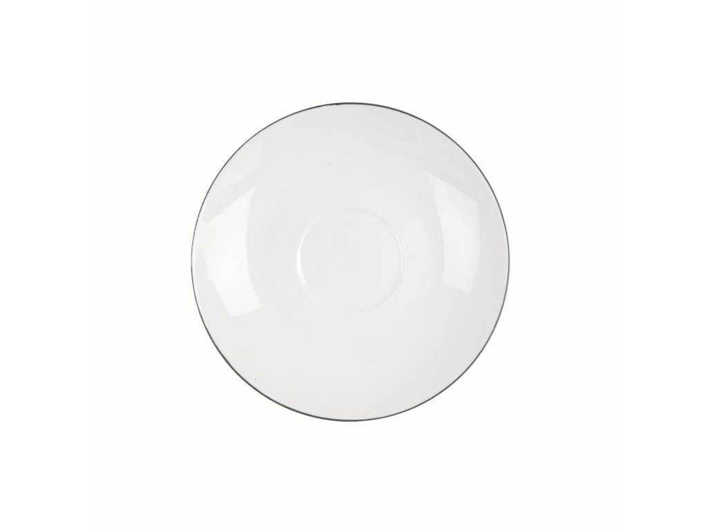 Elegantní porcelánový podšálek má hladký bílý povrch a je zdoben jemnou černou linkou po okraji, která podtrhuje jeho vytříbený vzhled. Ideální k hrnku na espresso 132215 – stylový doplněk pro každého milovníka kávy.