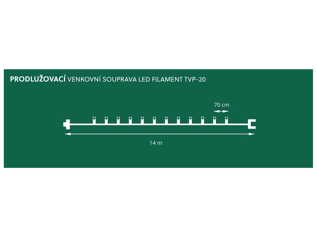 Prodlužovací řetěz pro LED Filament osvětlovací soupravu typ svíčka barevná SVP-20, bez napájecího transformátoruŘetěz je určen pro prodloužení základní osvětlovací soupravy s napájecím transformátorem. Celkem je je možné použít až 4 prodlužovací řetězy SVP-20