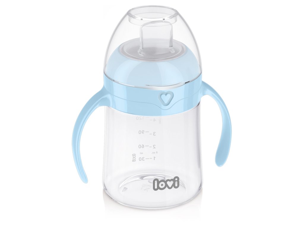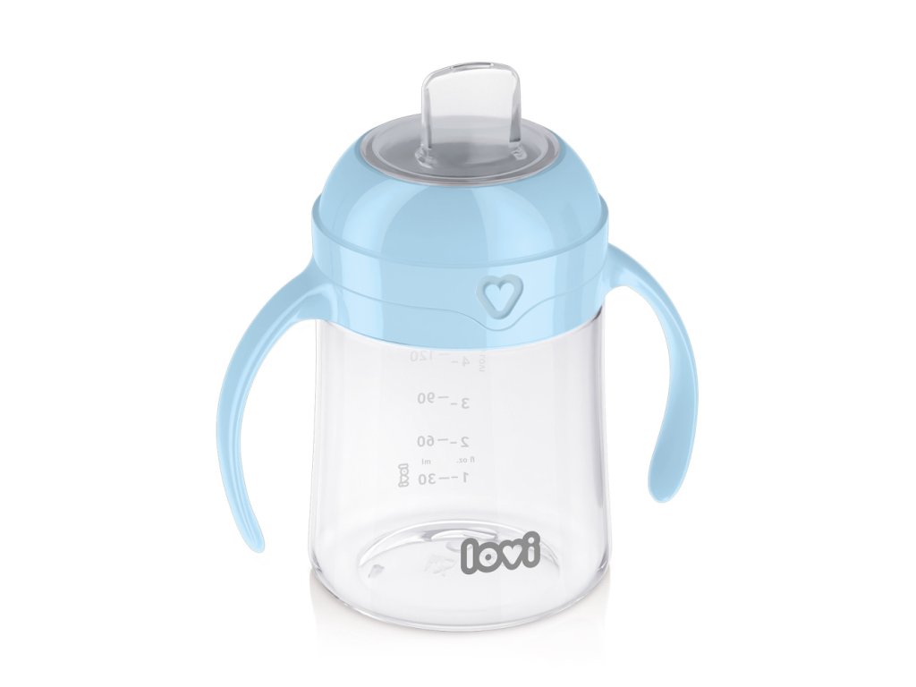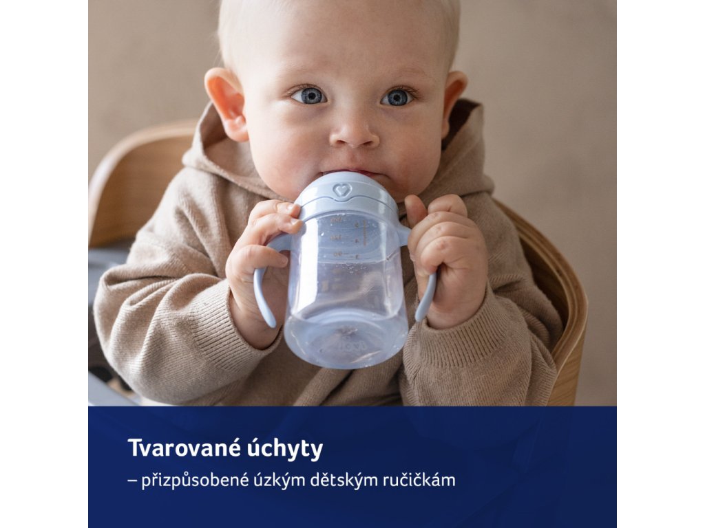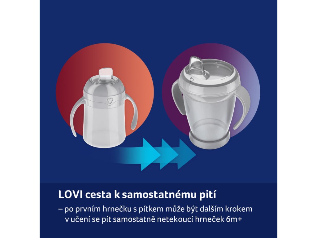 První hrneček Lovi v modré barvě s pítkem je dokonalý hrneček na to, aby se dítě naučilo samostatně pít již od 6 m+. Umožňuje snadnou a rychlou změnu způsobu pití z láhve na hrneček.Je praktický a lehký, profilované úchyty dokonale přiléhají na malé ručičky dítěte. Má výjimečně měkké pítko, profilované jako čajová lžička usnadňující naučení se pít.