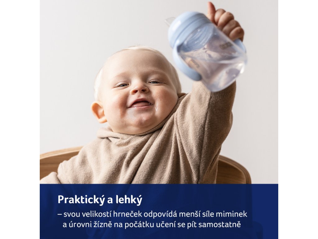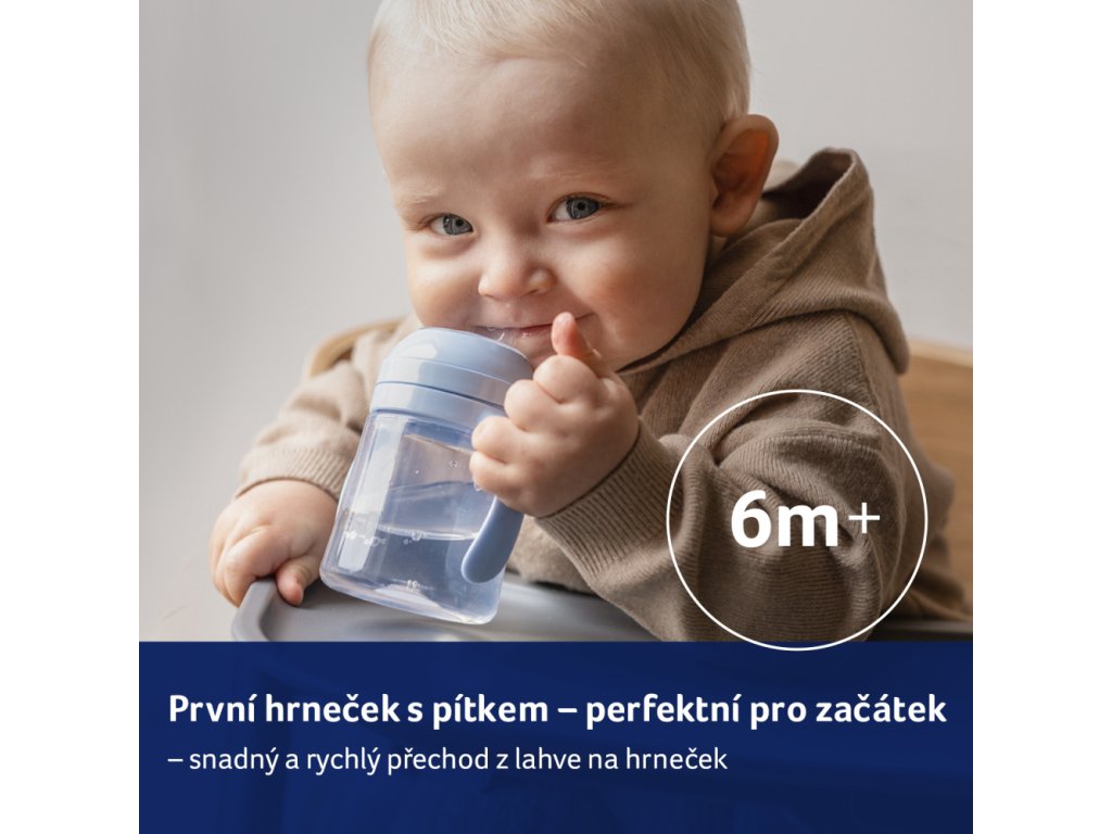 - Po prvním hrnečku s pítkem může být dalším krokem v naučení se pít nevylévající hrnek 6m+