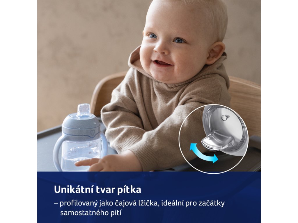 - Pítko je speciálně navrženo tak, aby z něj mohl nápoj volně kapat. Dítě proto nemusí vynakládat velké úsilí na učení se novým dovednostem a nenechá se odradit.