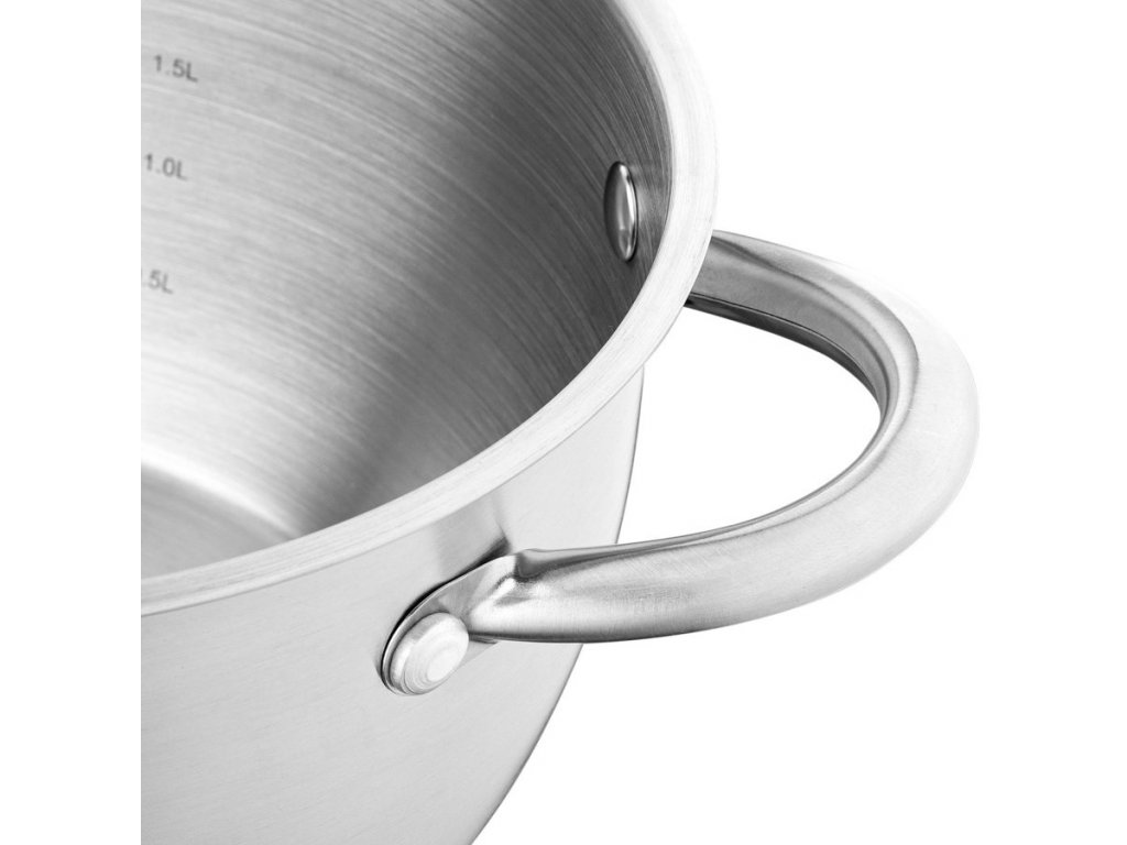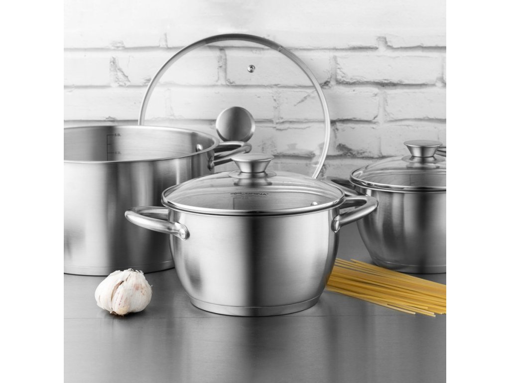 Potřebujete si vybavit kuchyň novými hrnci? Sada nerezových hrnců vám nabízí kvalitní provedení a pěkný design. Hrnce jsou vyrobeny z kvalitní nerezové oceli, která má dlouhou životnost a snadno se udržuje čistá. Sendvičové dno bylo navrženo pro rovnoměrné vedení tepla a možnost použít hrnce na všech typech ohřevu včetně indukce.V balení naleznete 4 hrnce různých objemů a ke každému z nich skleněnou poklici. Ta je vyrobena z varného skla a je opatřena nerezovým úchytem a parním ventilem. Hrnce včetně poklic můžete umývat v myčce na nádobí. Vnitřní strana hrnce je opatřena objemovou ryskou, víte přesně jaké je v hrnci množství vody.