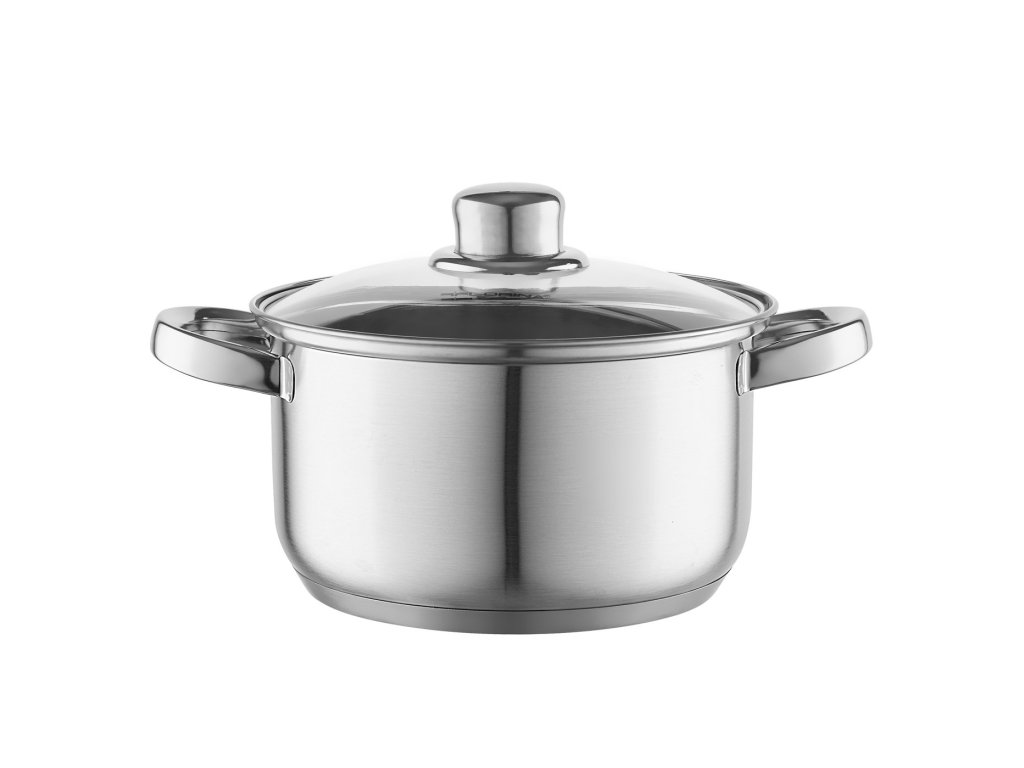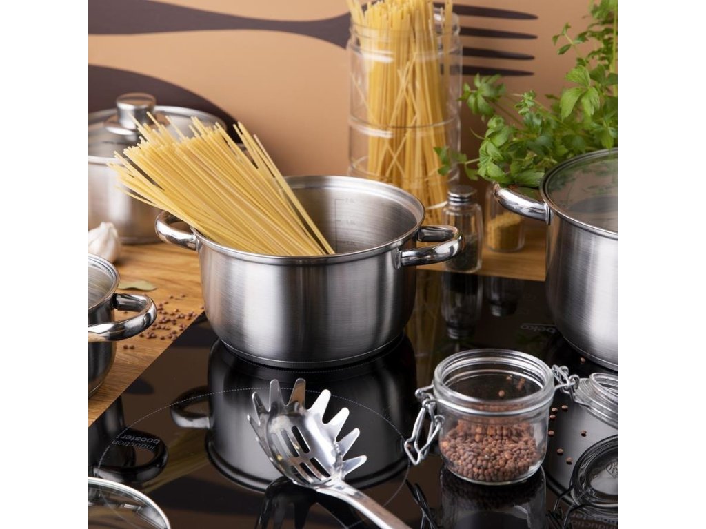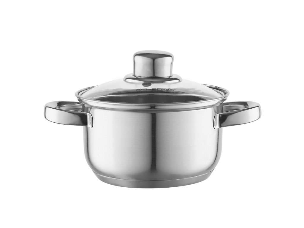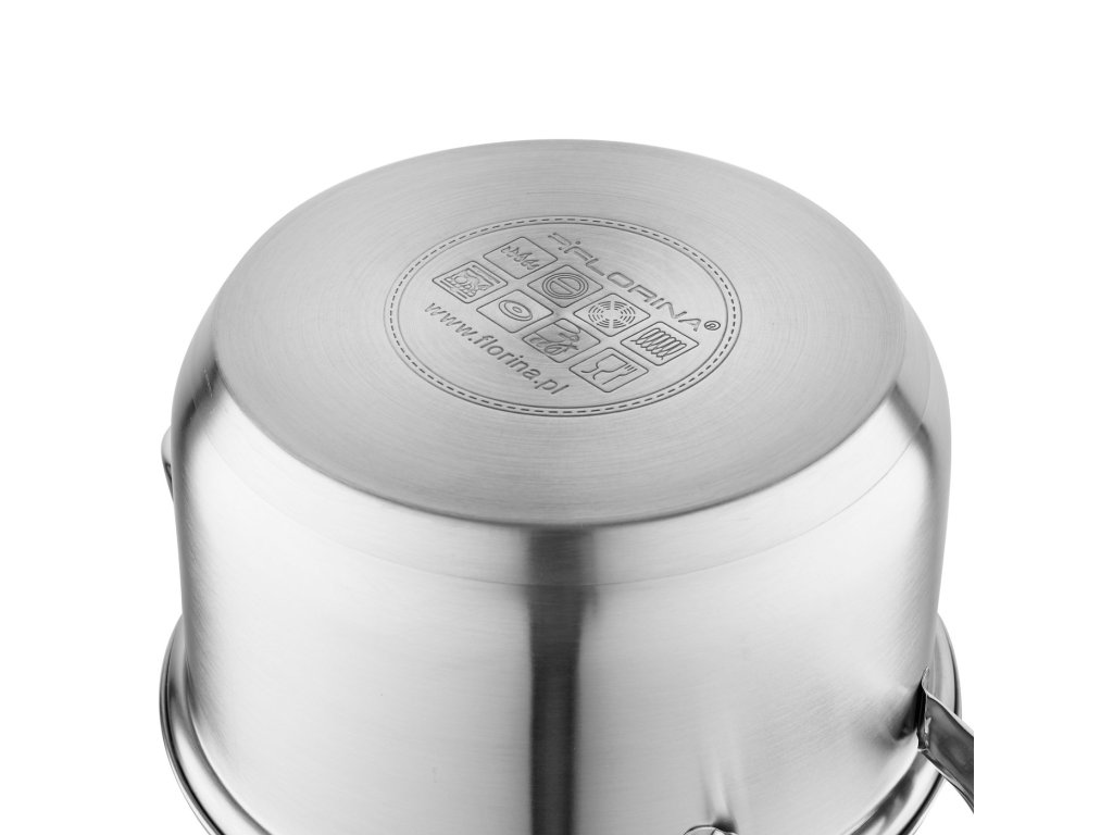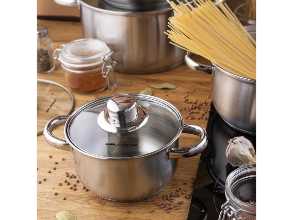 Sada nerezového nádobí Florina Polpo. Hrnce jsou vyrobeny z nerezové oceli o tloušťce stěny 0,4 mm. Ke každému hrnci je v balení také skleněná poklice s ventilem pro únik páry. Hrnce jsou vhodné na všechny typy sporáků včetně indukce. Povrch hrnců je matný.