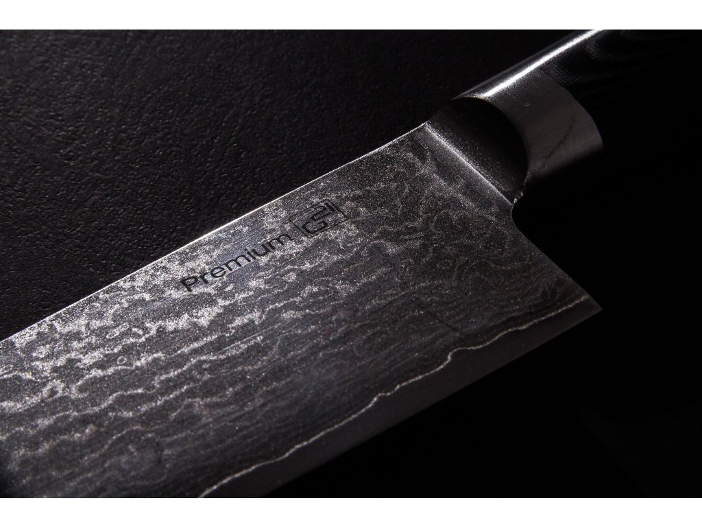 Čepel nože je z kvalitní 67vrstvé damaškové oceli VG-10 s tvrdostí 60 HRC (u běžných nožů se tvrdost pohybuje kolem 55 HRC, opravdu ostré nože mají tvrdost 58–60 HRC).