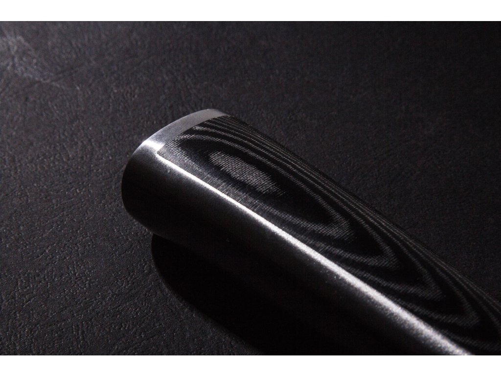 Rukojeť je vyrobena z extra pevného a odolného laminátového materiálu, nazývaného Micarta. Micartu tvoří plátno nebo skelná tkanina s termostatickou pryskyřicí. Výsledkem je pevná, houževnatá rukojeť, která nepodléhá zkáze času. Hladké, rovné, čisté linie těchto nožů se stanou ozdobou každé kuchyně.