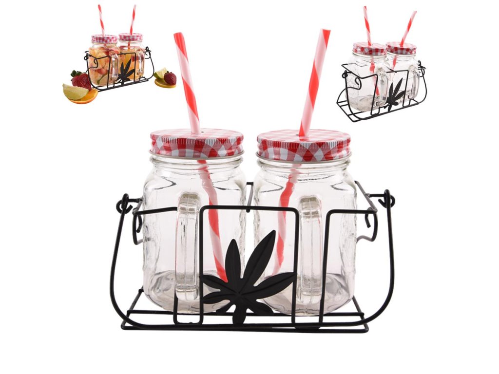 Láhev STRAW s uchem, víčkem a brčkem - sada 2 ks ve stojanu. Praktické servírování, zajímavé pohoštění na terase, zahradě, ale i pro party doma. Ve sklenici vynikne míchaný ovocný nápoj, díky víčku se vám nevylije, nemůže na něj dotěrný hmyz při letním posezení na terase nebo na zahradě. V praktickém drátěném stojánku nejen zajímavě vypadá, ale pohodlně se přenáší 2 láhve najednou.