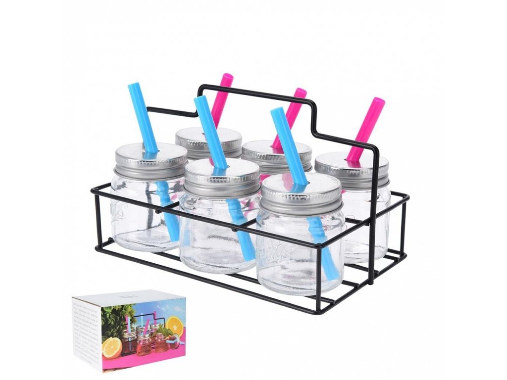 Sklenice STRAW s víčkem a brčkem - sada 6 ks ve stojanu. Praktické servírování, zajímavé pohoštění na terase, zahradě, ale i pro party doma. Ve sklenici vynikne míchaný ovocný nápoj, díky víčku se vám nevylije, nemůže na něj dotěrný hmyz při letním posezení na terase nebo na zahradě. V praktickém drátěném stojánku nejen zajímavě vypadá, ale pohodlně se přenáší 6 skleniček najednou. Materiál: sklo, kov, plast, drát. Rozměry: celá sada 16,5x11x11 cm, láhev objem 0,08 l, pr. 5 cm, v. 6/10 cm.