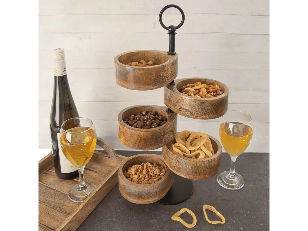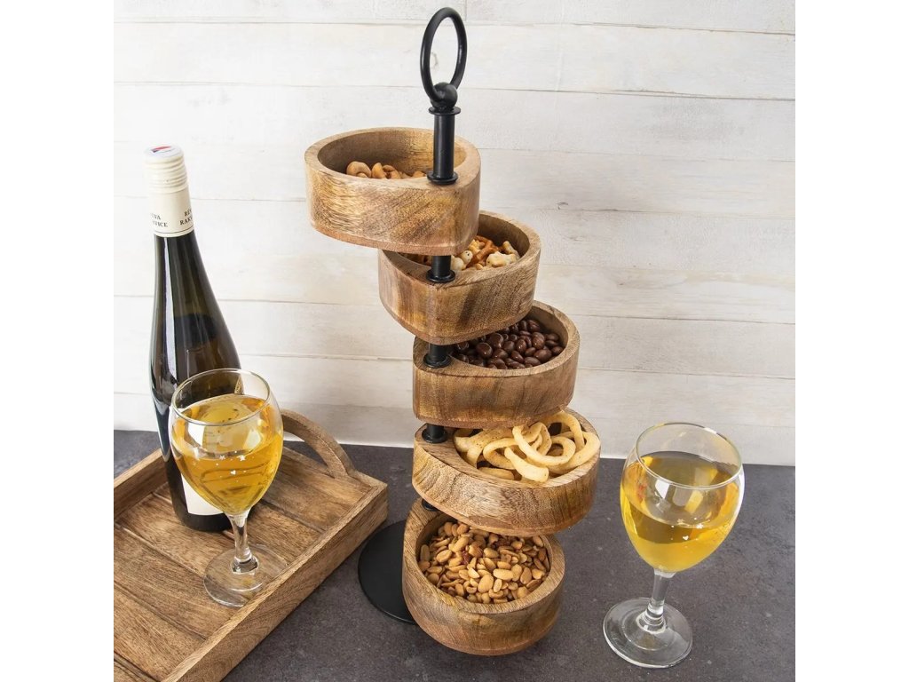 Opravdová designovka, která překvapí každou návštěvu nebo kamarádky, které přišly na skleničku. Netradiční stojan s černou kovovou základnou a 5 pohyblivými miskami se hodí pro servírování oříšků, brambůrků, sušenek, bonbónů, sušeného ovoce... Překvapíte své hosty netradičním servírováním a ušetříte místo na stole.