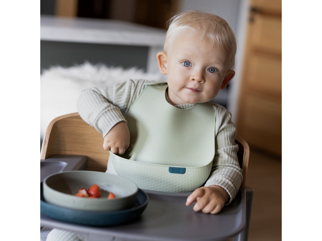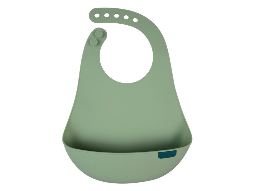 LOVI Silikonový bryndáček s kapsou je velkým pomocníkem pro rodiče - chrání před nečistotami v době, kdy se dítě učí samostatně jíst. Je vyroben z lehkého, měkkého a bezpečného silikonu. Pevná a hluboká kapsa zachycuje zbytky jídla, pohodlně obepíná bříško a zasahuje doširoka do boků miminka. Nastavitelná spona a ergonomický tvar bryndáku, zejména jeho tvarované strany, zajišťují volnost pohybu. Bryndáček má originální design díky unikátní struktuře kapsy a také se snadno čistí a je vhodný do myčky.