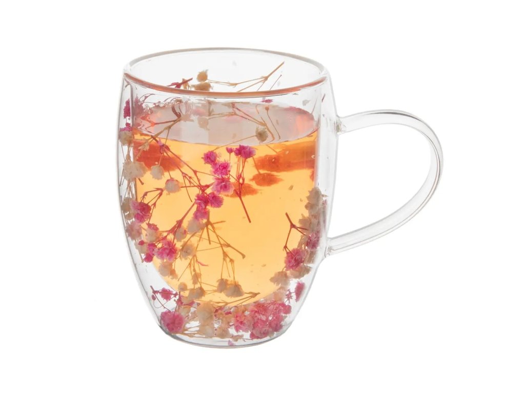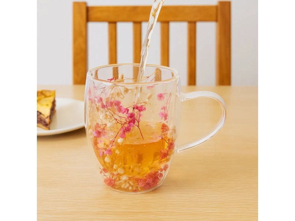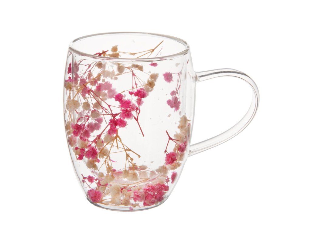 Dvoustěnný hrnek s kvítky uvnitř je elegantním a nápaditým doplňkem do každé domácnosti. Díky dvojitému sklu má skvělé izolační vlastnosti. Dvojité borosilikátové sklo udrží dlouho teplotu nápoje, takže ranní káva jen tak nevychladne a osvěžující nápoje v letním horku zůstanou déle chladné. Výhodou je také odolnost vůči vysokým a nízkým teplotám a poškrábání. Uvnitř jsou zakomponované jemné sušené květy. Ideální je na čaj, kávu i domácí limonádu a jiné nápoje. Lze ho využít i jako dekorativní prvek.