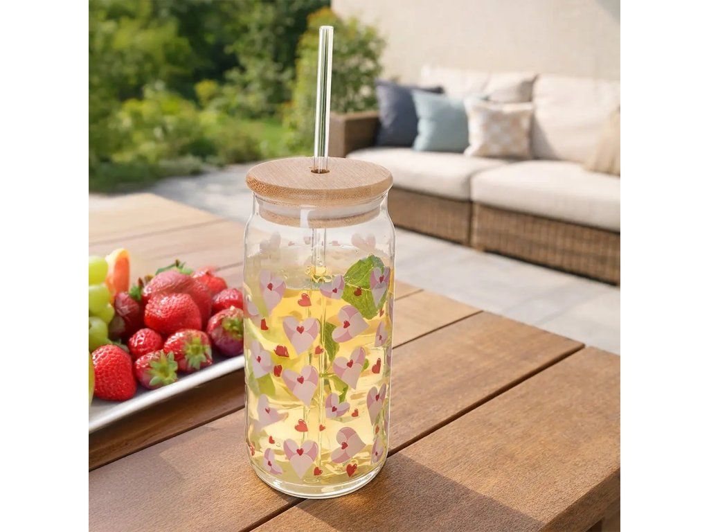 Víčko umožňuje přímé pití pomocí přiloženého skleněného brčka, nebo lze sklenici používat samostatně bez víčka a brčka. Skvěle se hodí pro domácí limonádu, ovocnou šťávu nebo jakýkoliv jiný oblíbený nápoj. Sklenice je vyrobena z kvalitního odolného skla, díky čemuž je vhodná pro běžné používání.